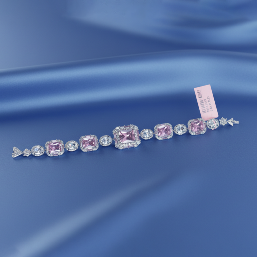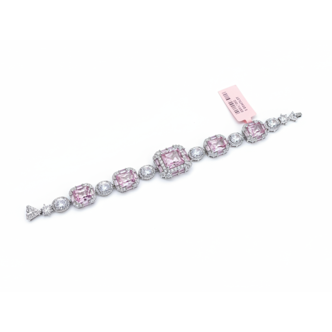 This glamorous silver-toned link bracelet showcases dazzling pink square/cushion-cut stones, each encircled by a halo of brilliant clear cubic zirconia (CZ). The stones alternate with smaller, fully-paved clear round clusters, creating a beautiful and luxurious statement piece perfect for weddings, parties, or special occasions.