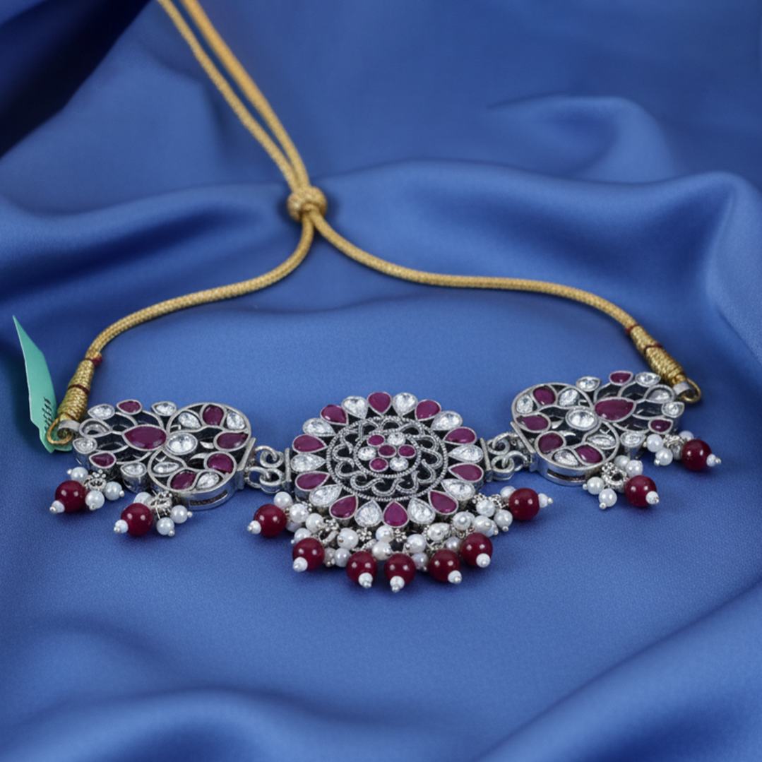 This is a stunning ethnic statement choker crafted in an oxidized silver tone. It features three elaborate circular floral motifs set with deep ruby/pink stones (Kundan style) and sparkling clear accents. The design is heavily embellished with clusters of dangling red beads and tiny white pearls, making it perfect for traditional festivals or wedding functions.