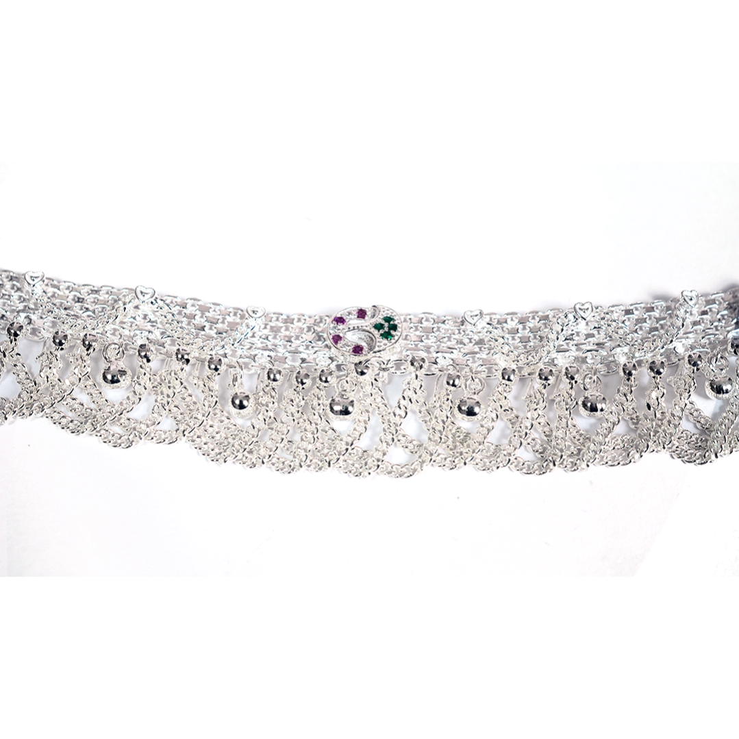 This beautifully crafted silver-plated payal combines intricate chain detailing with a graceful jhalar-style lower edge that moves delicately with every step. The addition of subtle multi-color stones enhances its traditional appeal while adding a refined touch of elegance.