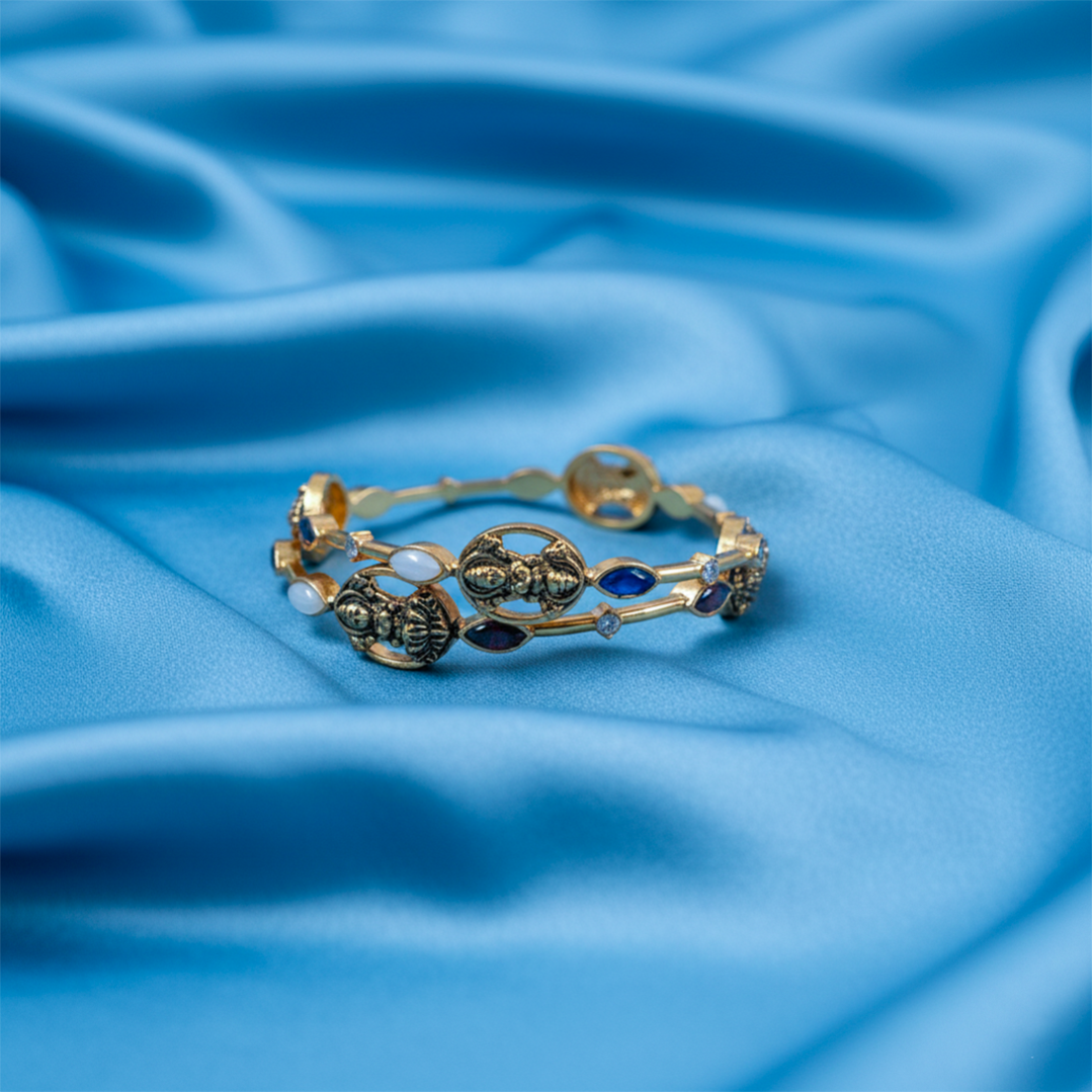 This exquisitely designed antique gold-tone temple bangle showcases the beauty of traditional craftsmanship with a blend of intricate carvings and vibrant stones. The bangle features divine temple-inspired motifs, oval artistic frames, and ornamental floral detailing that reflect timeless Indian heritage. The addition of multi-colored stones—including green, purple, and white accents—enhances the overall charm and adds a regal touch.