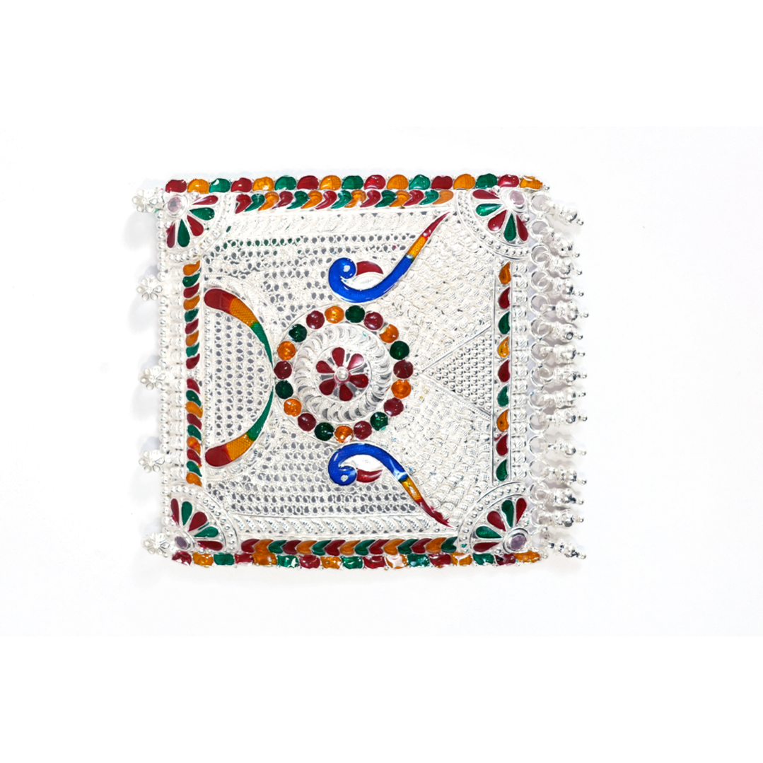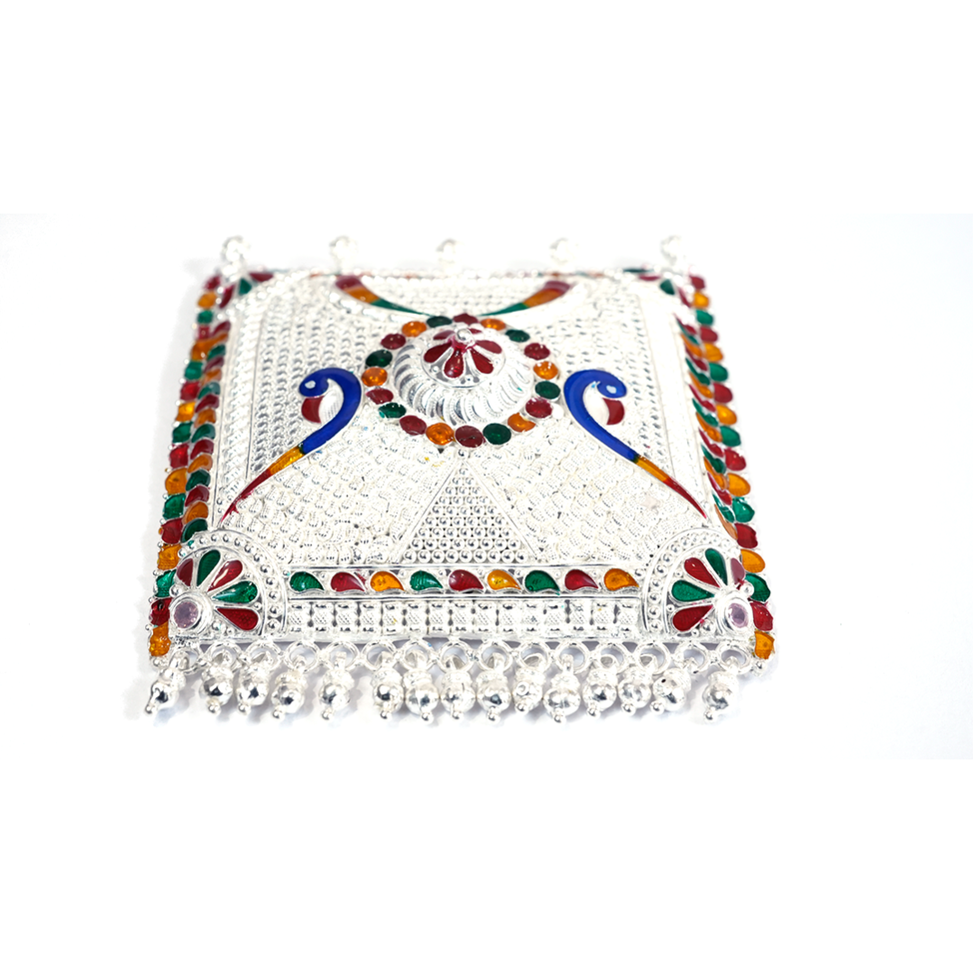 This beautifully crafted Silver Meenakari Double Peacock Wall Hanging showcases vibrant enamel detailing and intricate embossed patterns. Perfect for enhancing pooja rooms, doorways, and living spaces, it adds a touch of traditional elegance to your home décor.