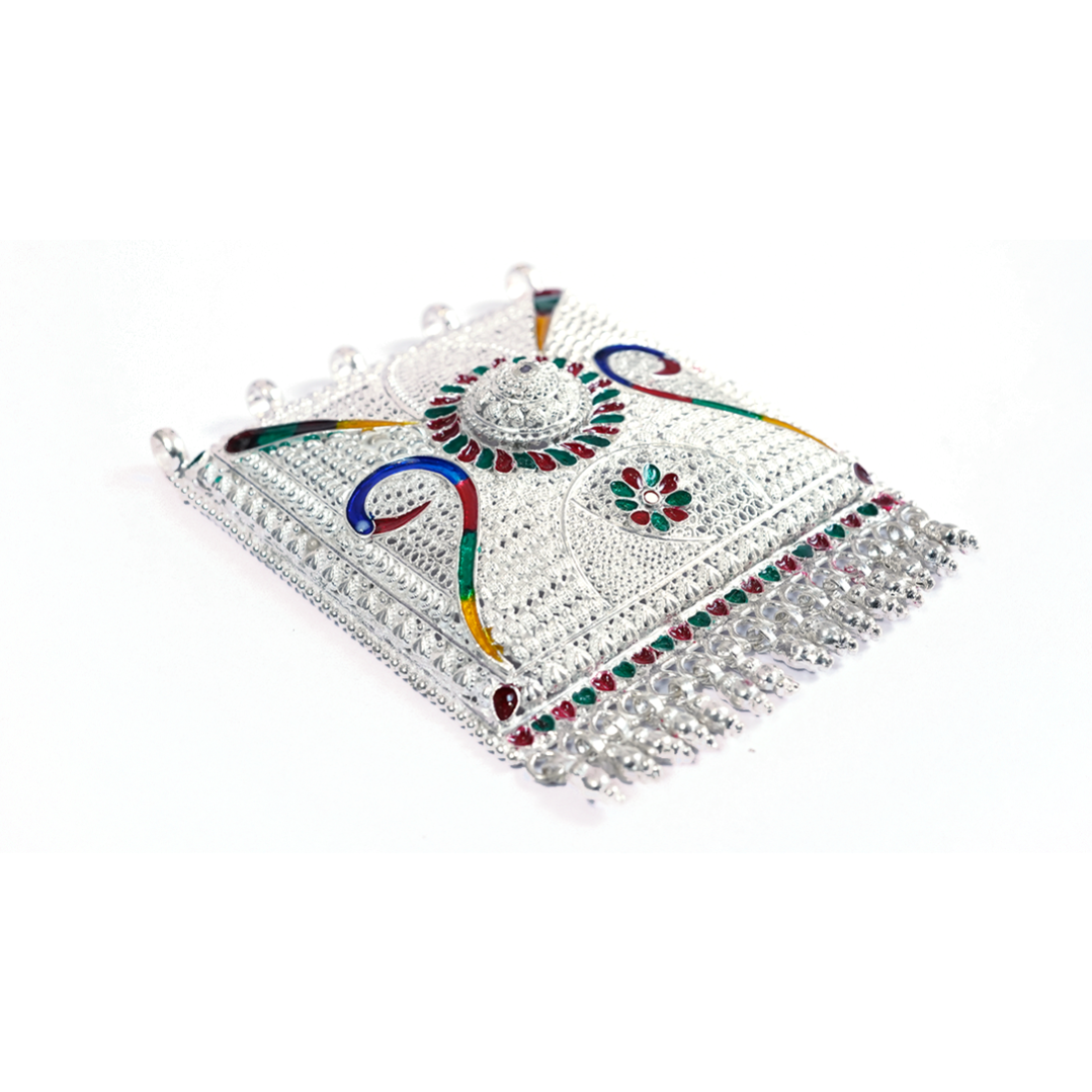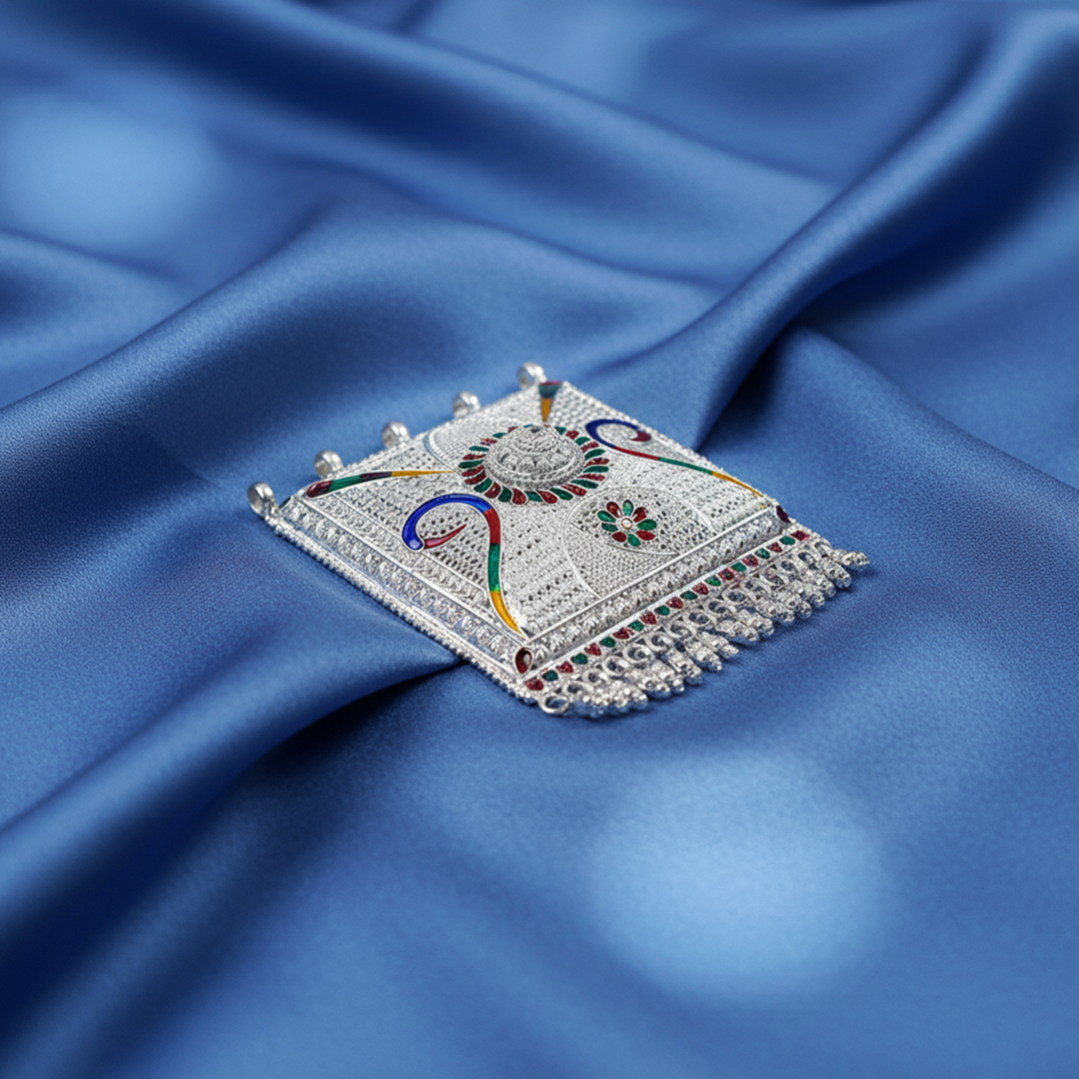 Striking Peacock Motif Choker. A dual-tone oxidized necklace featuring classic peacock designs, set with sparkling pink stones and finished with elegant pearl drops, secured by an adjustable black dori.