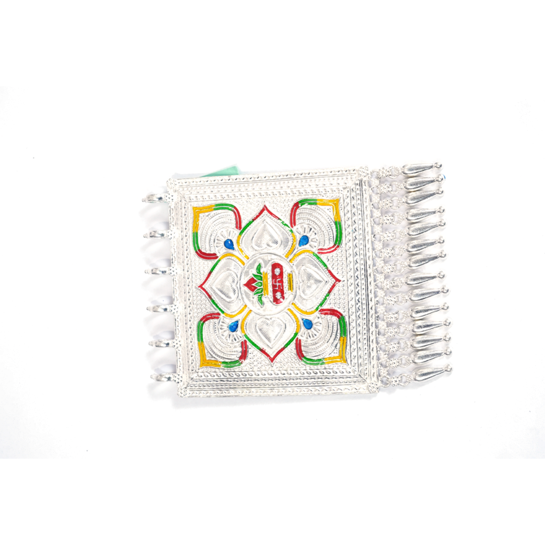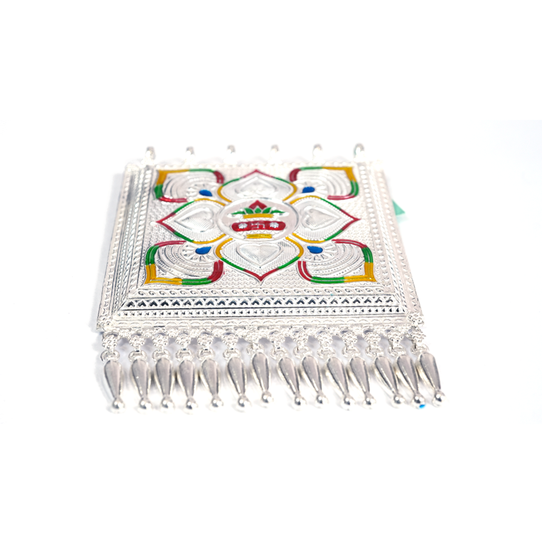 Description: Yeh ek bada, chaukor (rectangular) pendant hai, jismein Meenakari (enamel work) se bana hua ek bada Floral (Phool) design hai aur 'OM' ya 'Shree' ka chinha dikh raha hai.