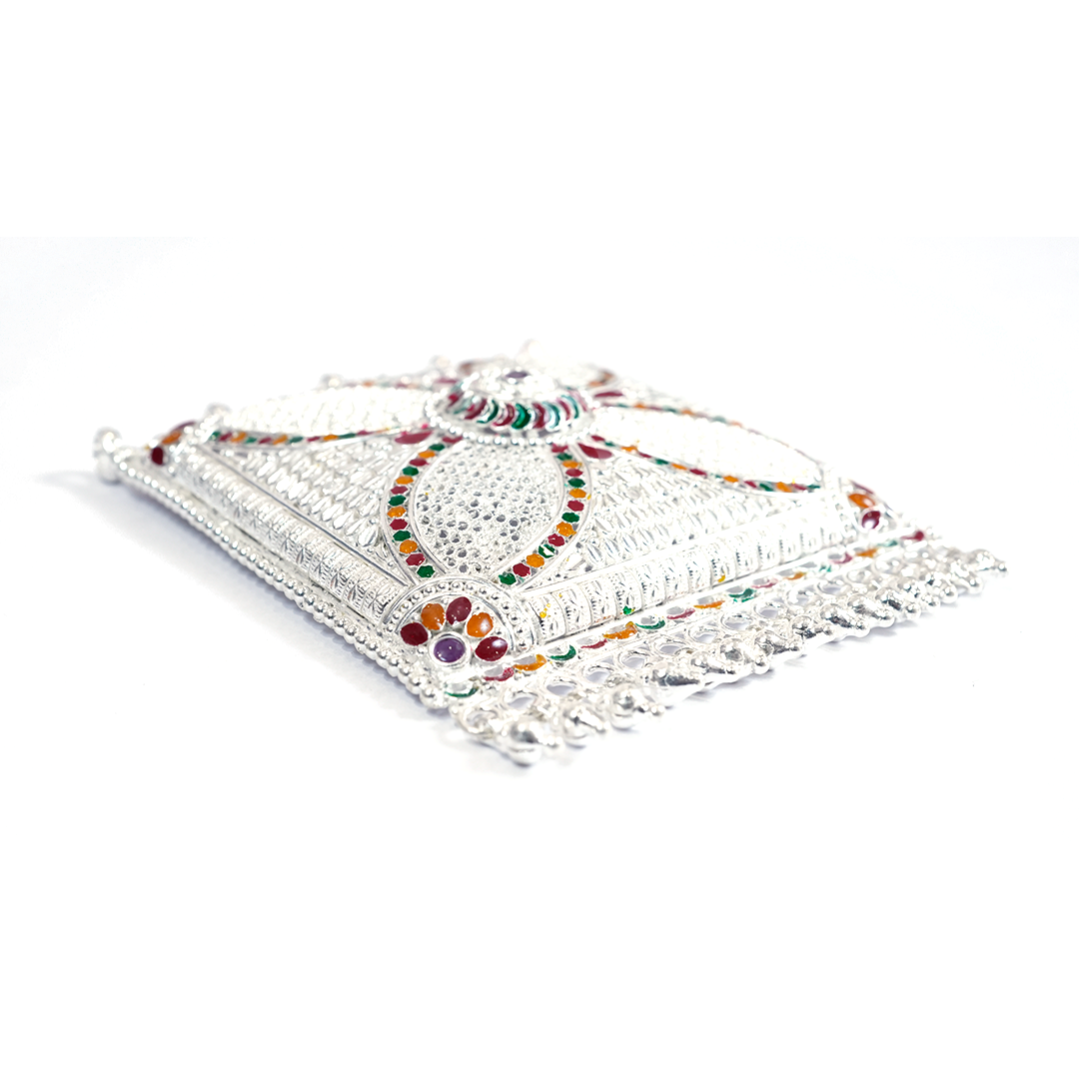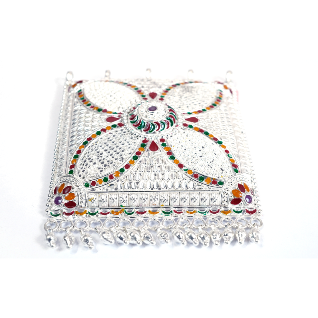 Grand Filigree Peacock Pendant. This large, oxidized rectangular piece showcases intricate Indian Jaali work with a vibrant multi-color Meenakari peacock design at the center, perfect for a heavy, authentic ethnic statement.