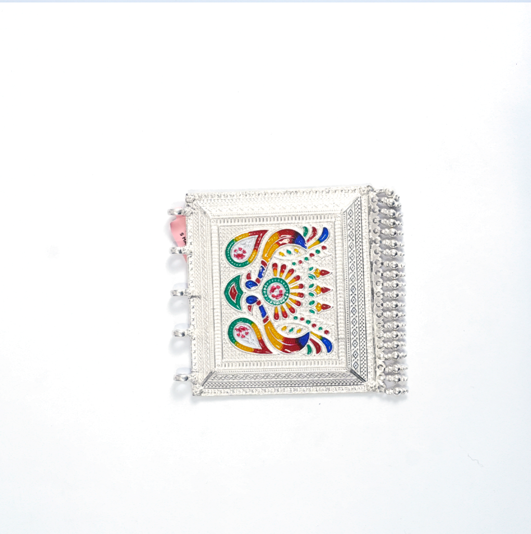 Striking Peacock Motif Choker. A traditional dual-tone oxidized necklace featuring classic peacock designs, set with sparkling pink stones and finished with elegant pearl drops, secured by an adjustable black dori.