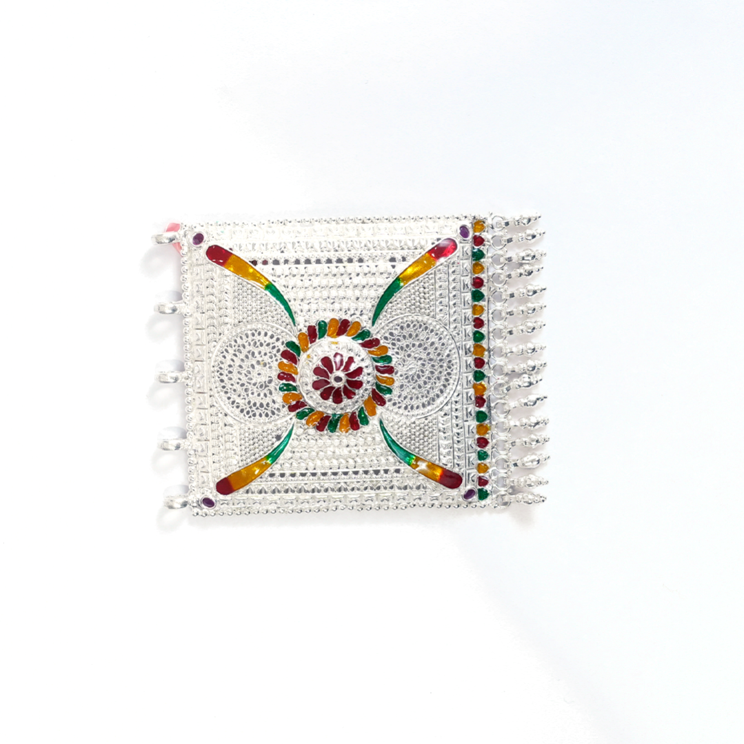 Striking Motif Choker. A dual-tone oxidized necklace featuring classic designs, set with sparkling pink stones and finished with elegant pearl drops, secured by an adjustable black dori.