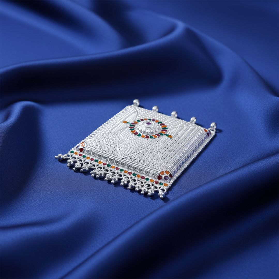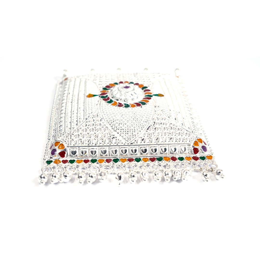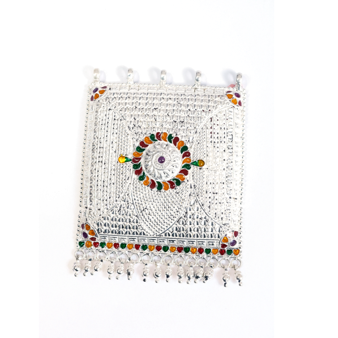 Exquisite Oxidized Filigree Statement Pendant. A masterpiece of traditional Indian Jaali work, this large rectangular pendant features intricate net design and subtle multi-color stone accents, perfect for an authentic tribal or ethnic look.