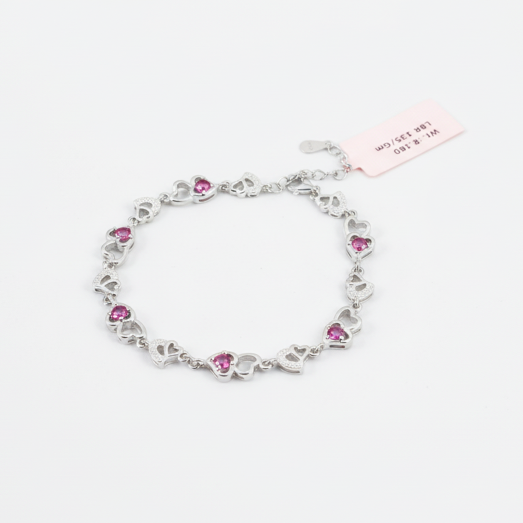 This is a delicate sterling silver-toned bracelet featuring interlocking open-heart links. Each link is accented with a sparkling, heart-cut pink or ruby stone, creating a romantic and elegant design. It includes an adjustable chain clasp for a perfect fit, making it ideal for everyday wear or as a thoughtful gift.