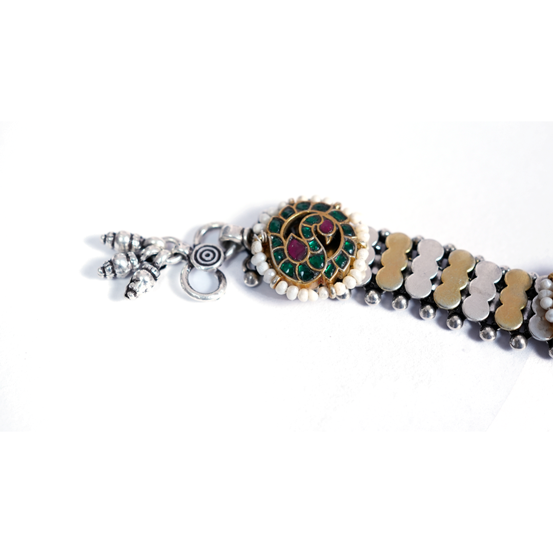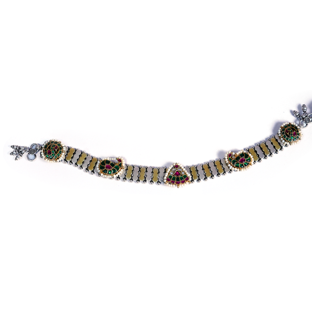 This traditional oxidised payal showcases a unique blend of heritage artistry and colorful elegance. Crafted with a sturdy oxidised silver finish, the design features multiple hand-crafted meenakari-style motifs adorned with vibrant red and green stones. The intricate detailing and antique look give it a royal and cultural charm.