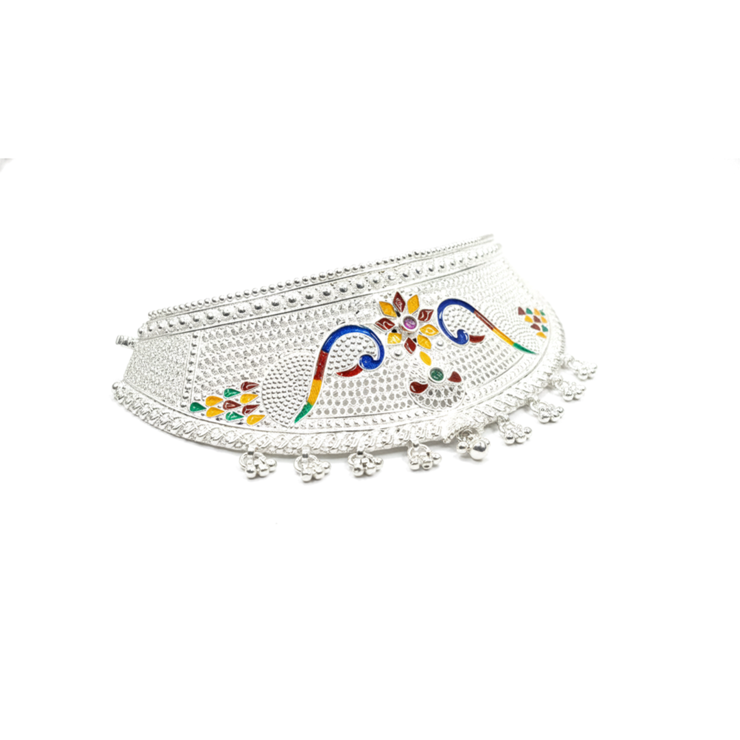 A beautifully crafted oxidised silver choker featuring vibrant multicolour enamel artwork and delicate ghungroo hangings. Perfect for festive, cultural, and ethnic outfits.