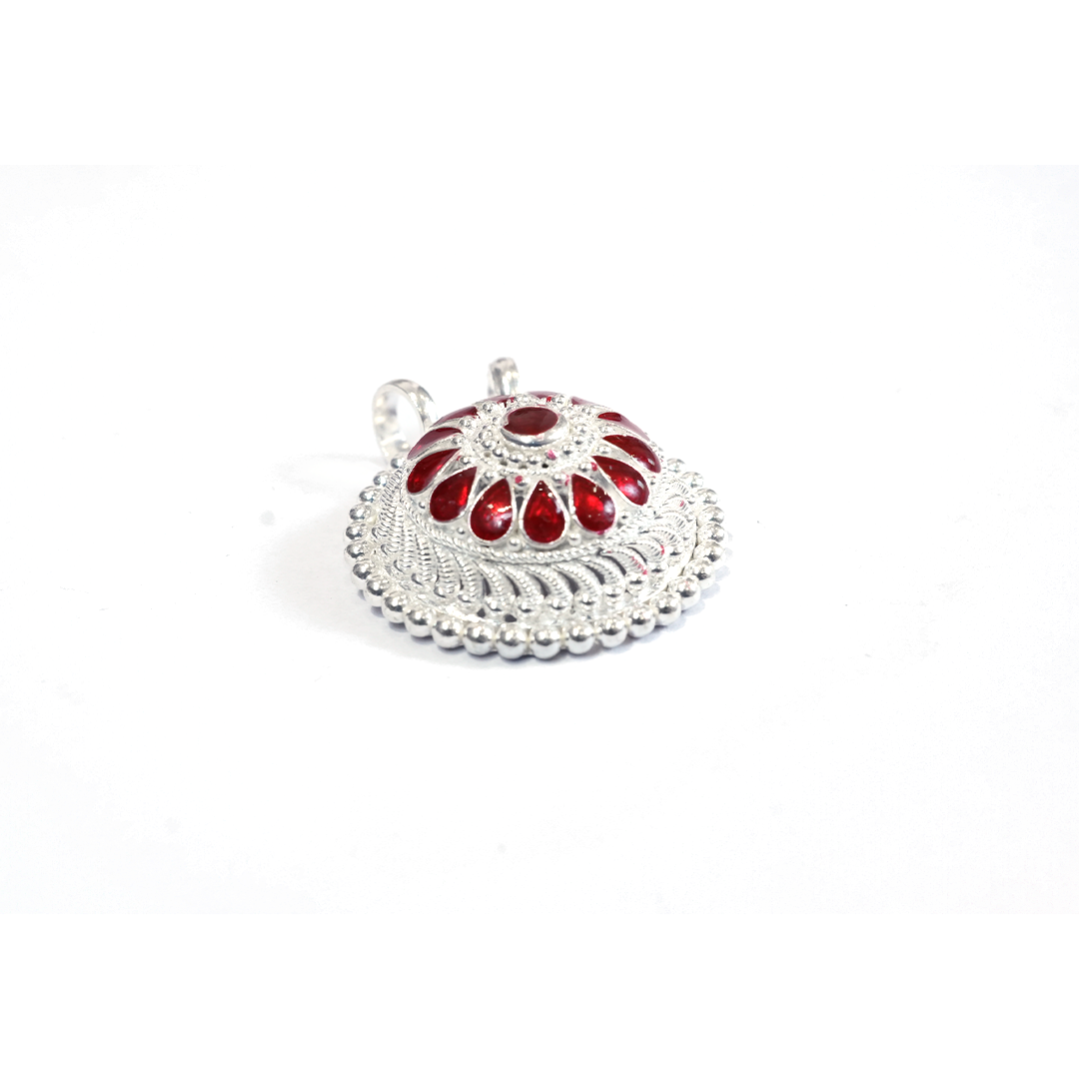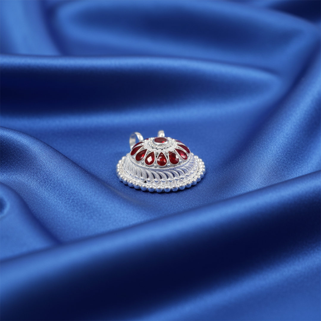 Elegant oxidized silver pendant adorned with red teardrop stones in a floral design, perfect for ethnic and festive wear.