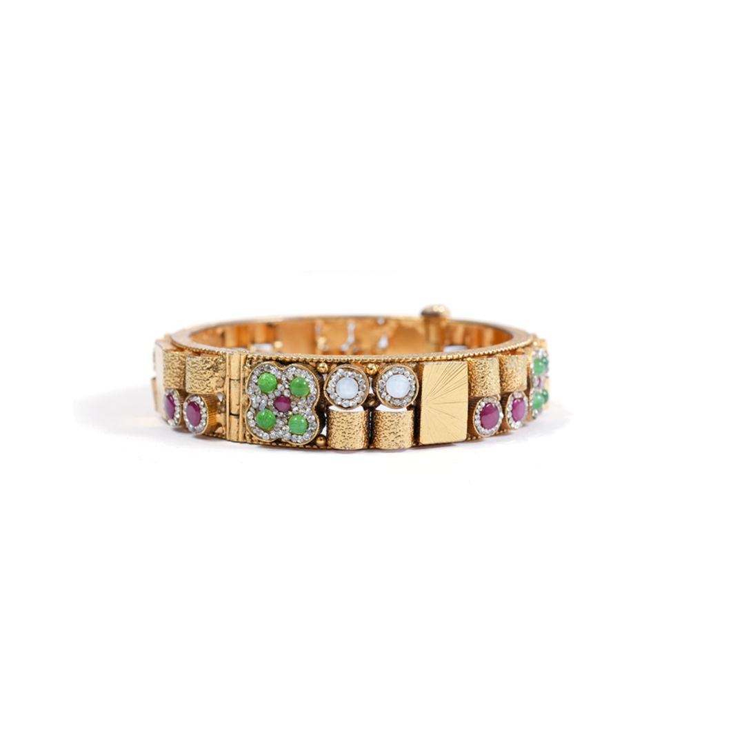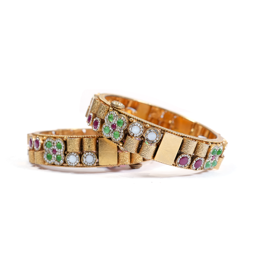 Traditional antique gold bangles decorated with green, ruby, and pearl floral stone clusters, crafted in a textured design with a secure screw closure.