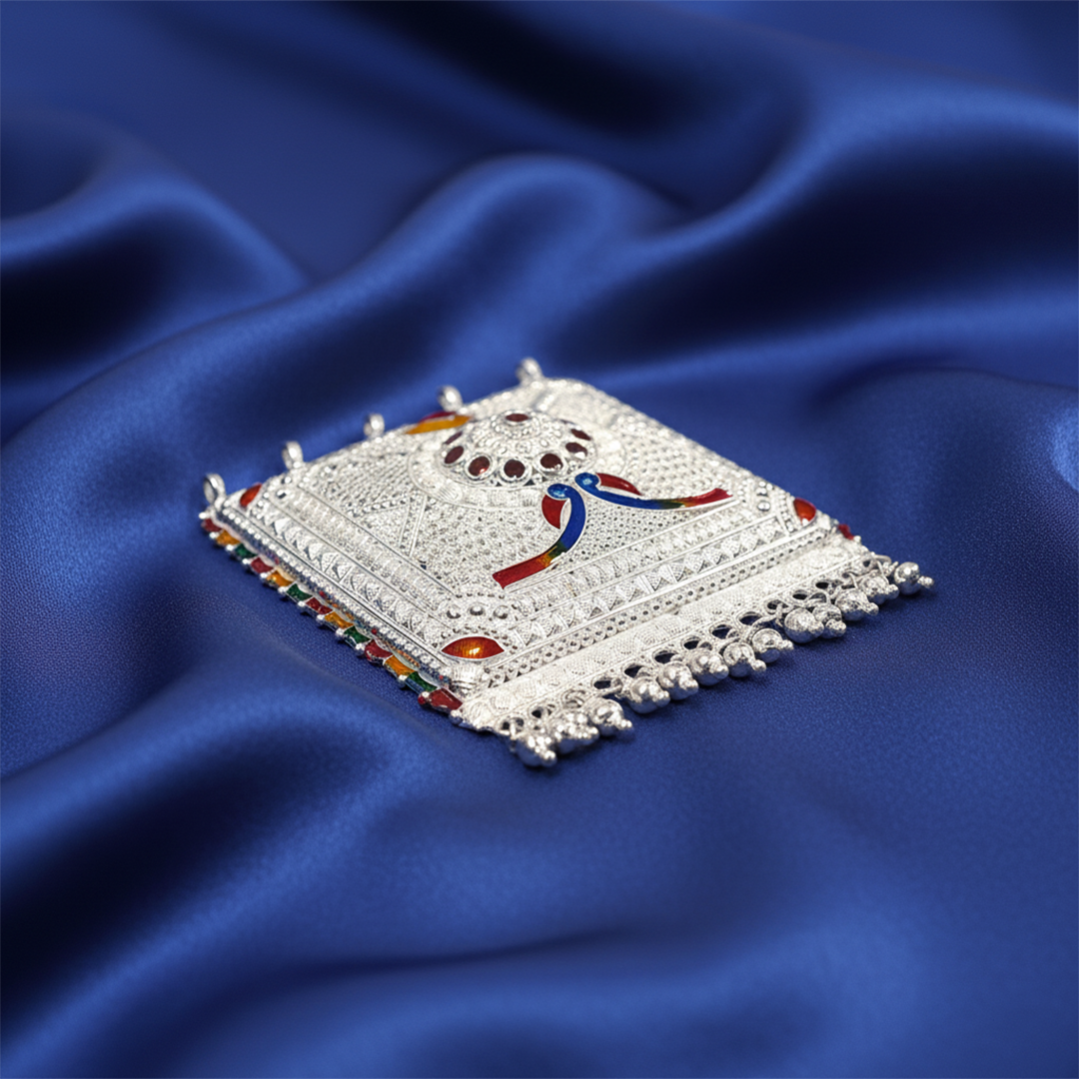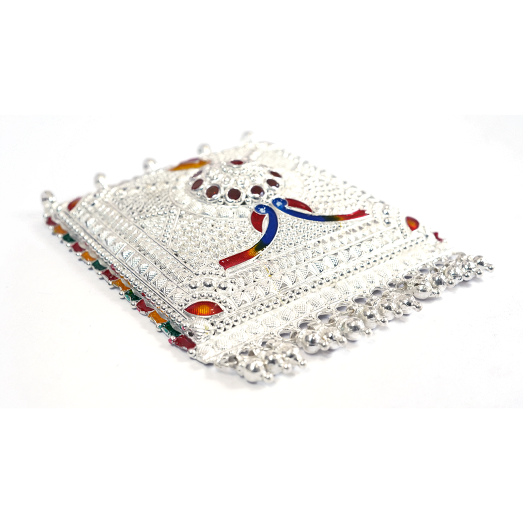 This beautifully handcrafted Silver Meenakari Decorative Wall Hanging features intricate embossed patterns and colorful enamel work. Its traditional design and detailed craftsmanship make it an elegant addition to pooja rooms, doorways, and home décor spaces.