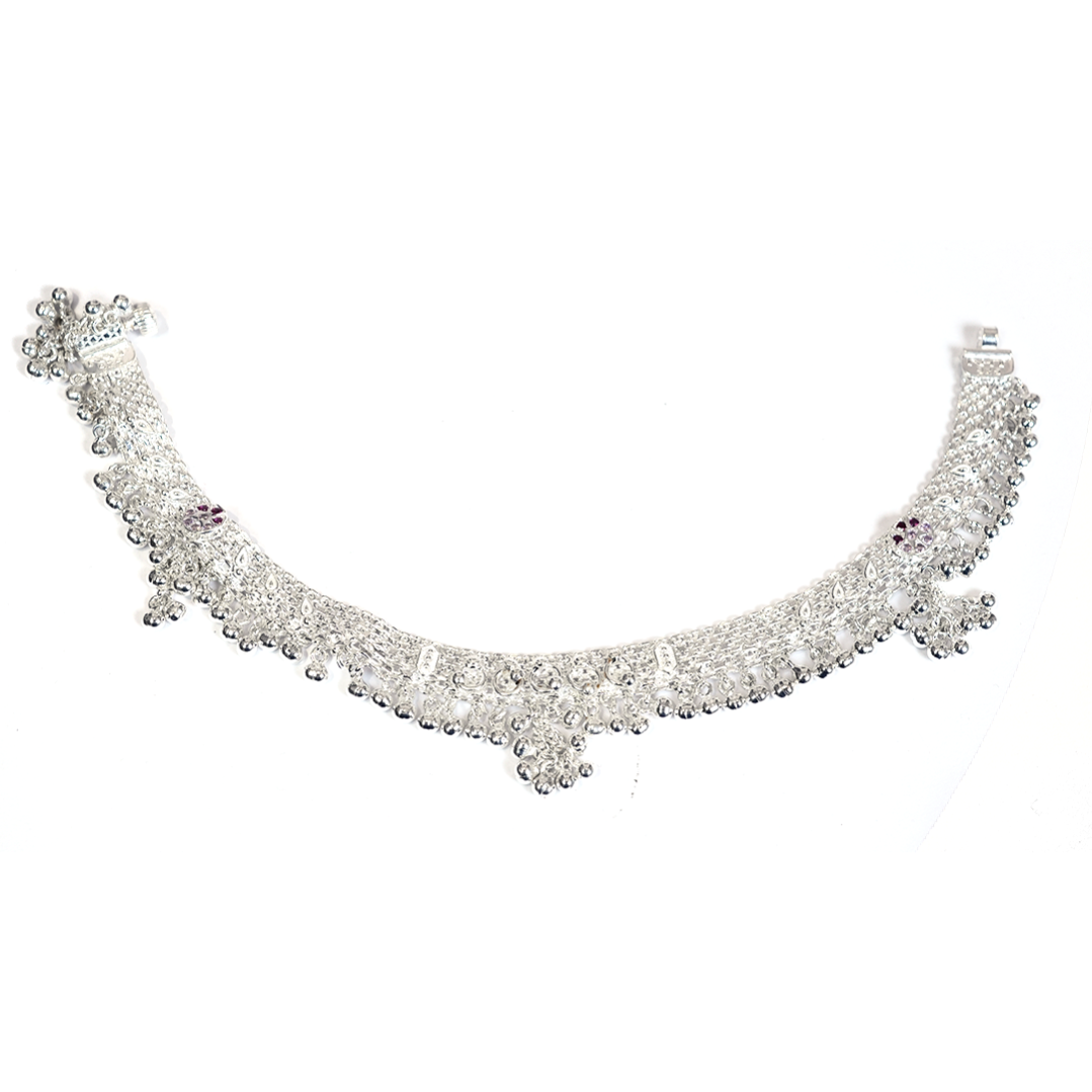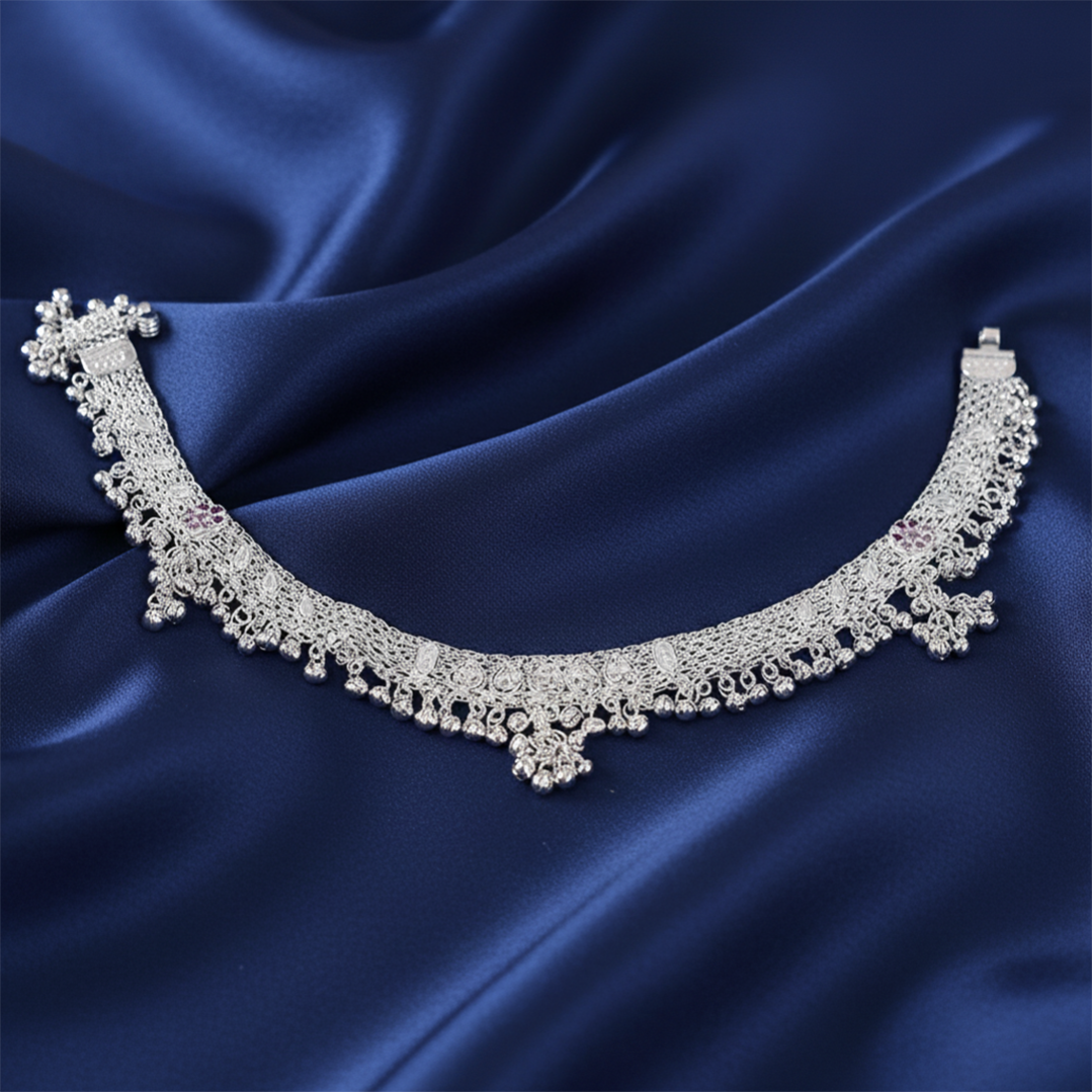 Beautiful silver-plated bridal payal crafted with intricate filigree work and dangling charms. Perfect for weddings, festive occasions, and traditional wear. Lightweight, elegant, and designed to enhance every ethnic outfit.