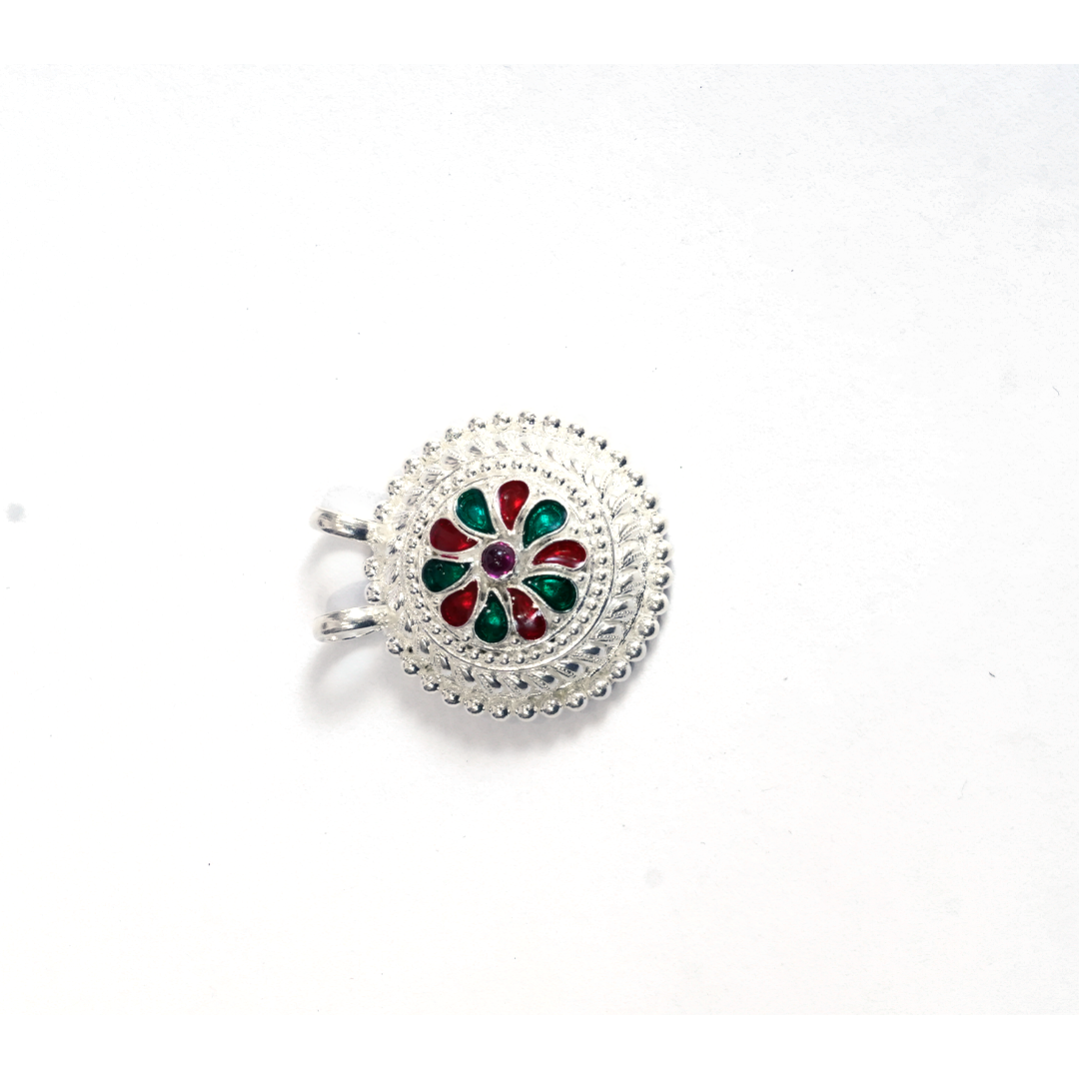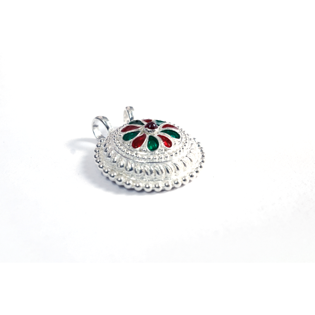 This handcrafted Silver Meenakari Pendant features a beautiful dome-shaped ethnic design with vibrant enamel detailing. Its elegant finish makes it perfect for pairing with traditional outfits, festivals, and daily ethnic wear.