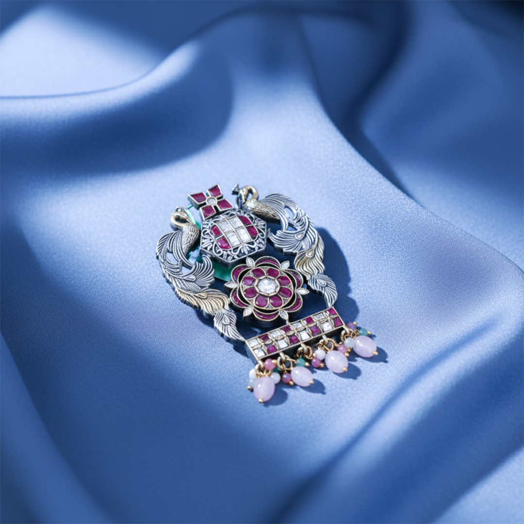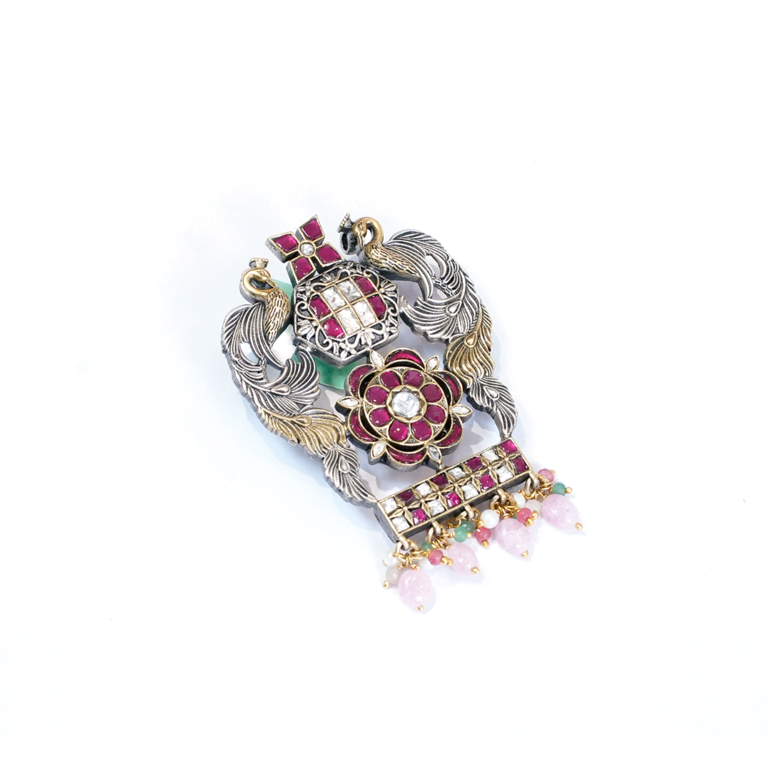 Striking Traditional Choker featuring an intricate oxidized silver-tone peacock and floral pendant, beautifully set with pink and clear stones and accented with vibrant multi-color drops.