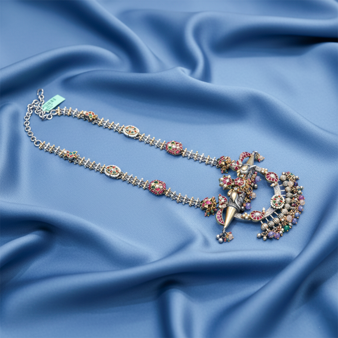 A beautifully crafted oxidised silver temple necklace featuring dual-layer chains, colorful stone embellishments, and an ornate traditional pendant with bead danglers—perfect for festive, bridal, and ethnic wear.