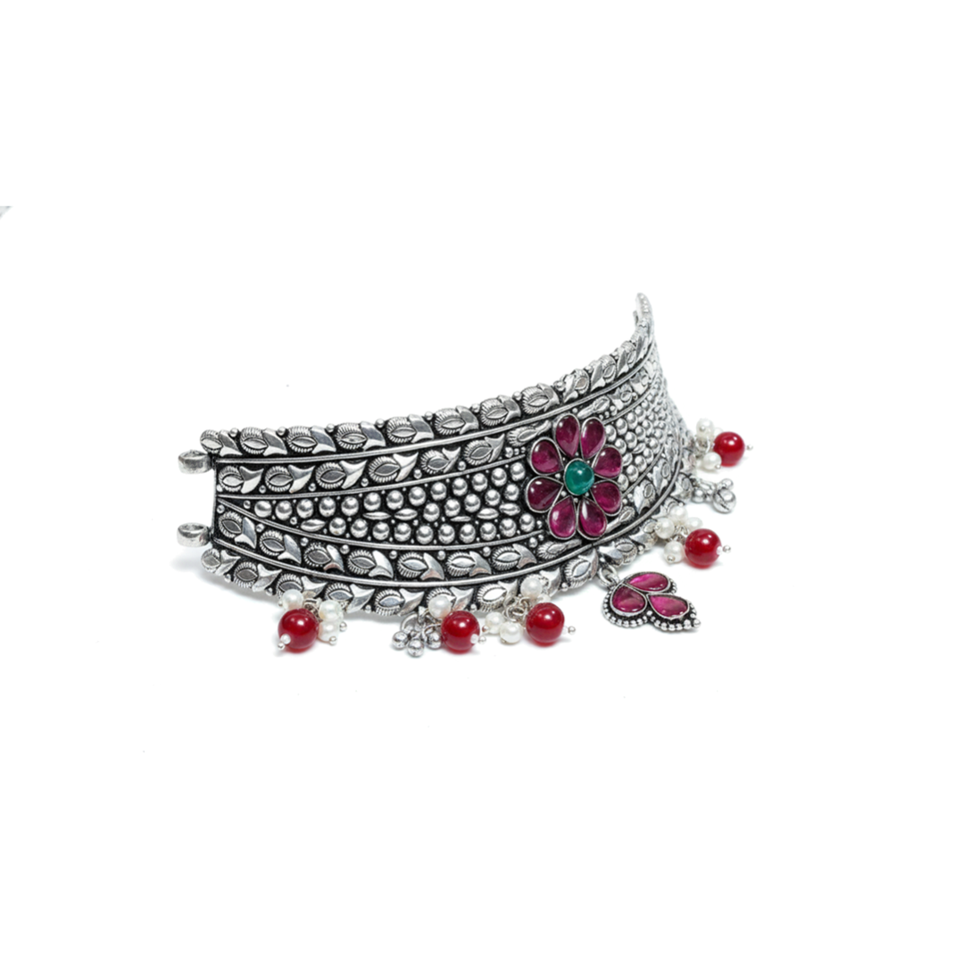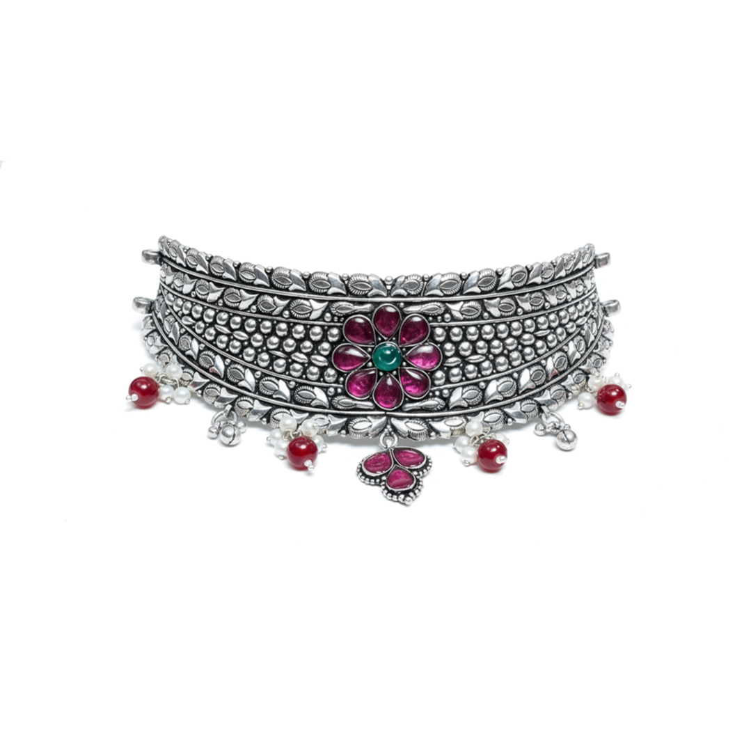 This is an exquisite oxidized silver statement choker featuring intricate floral carvings and a central flower motif adorned with vibrant ruby-pink and emerald-green stones. Finished with delicate pearl and deep red bead drops, it captures the essence of traditional ethnic and bohemian style.