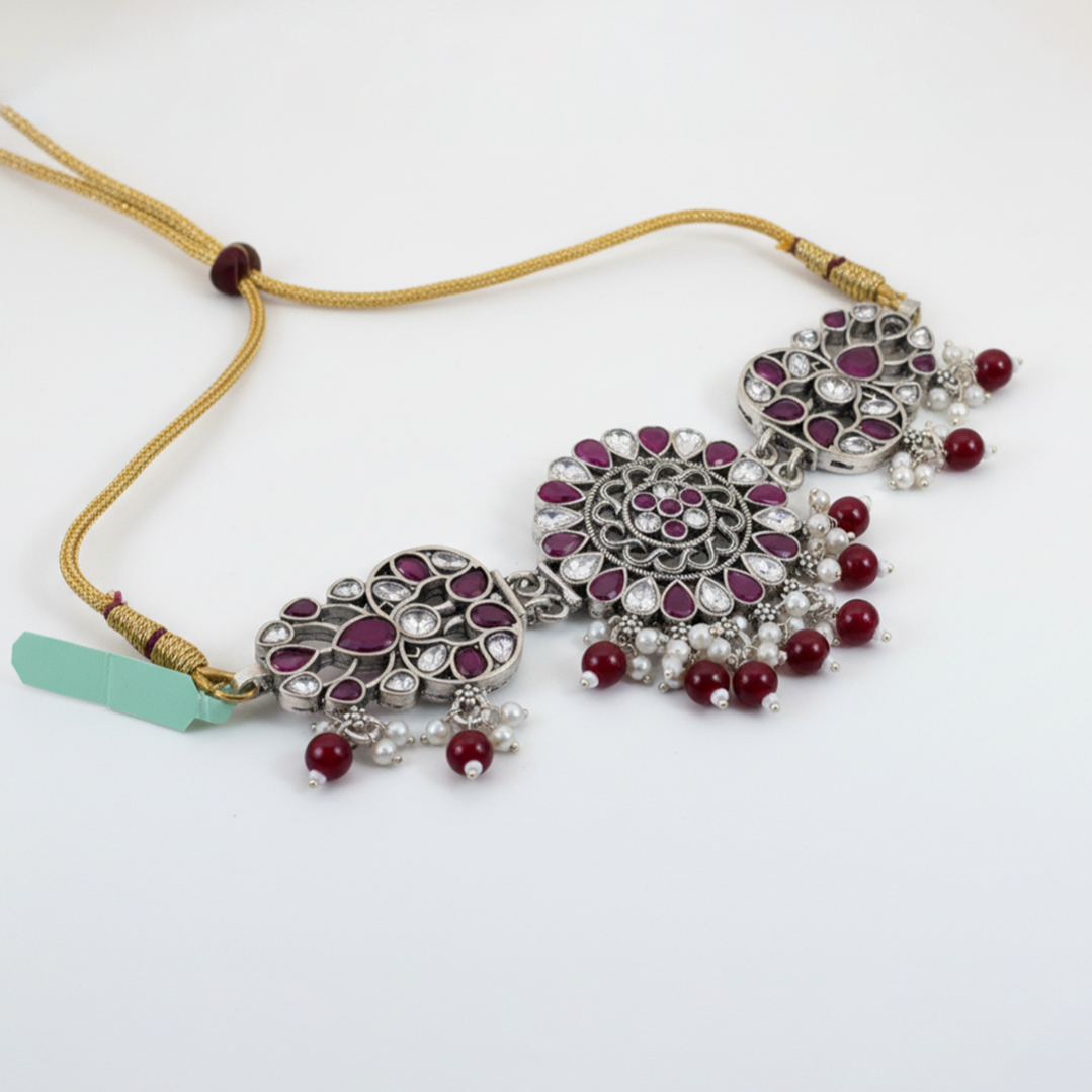 This is a stunning ethnic statement choker crafted in an oxidized silver tone. It features three elaborate circular floral motifs set with deep ruby/pink stones (Kundan style) and sparkling clear accents. The design is heavily embellished with clusters of dangling red beads and tiny white pearls, making it perfect for traditional festivals or wedding functions.