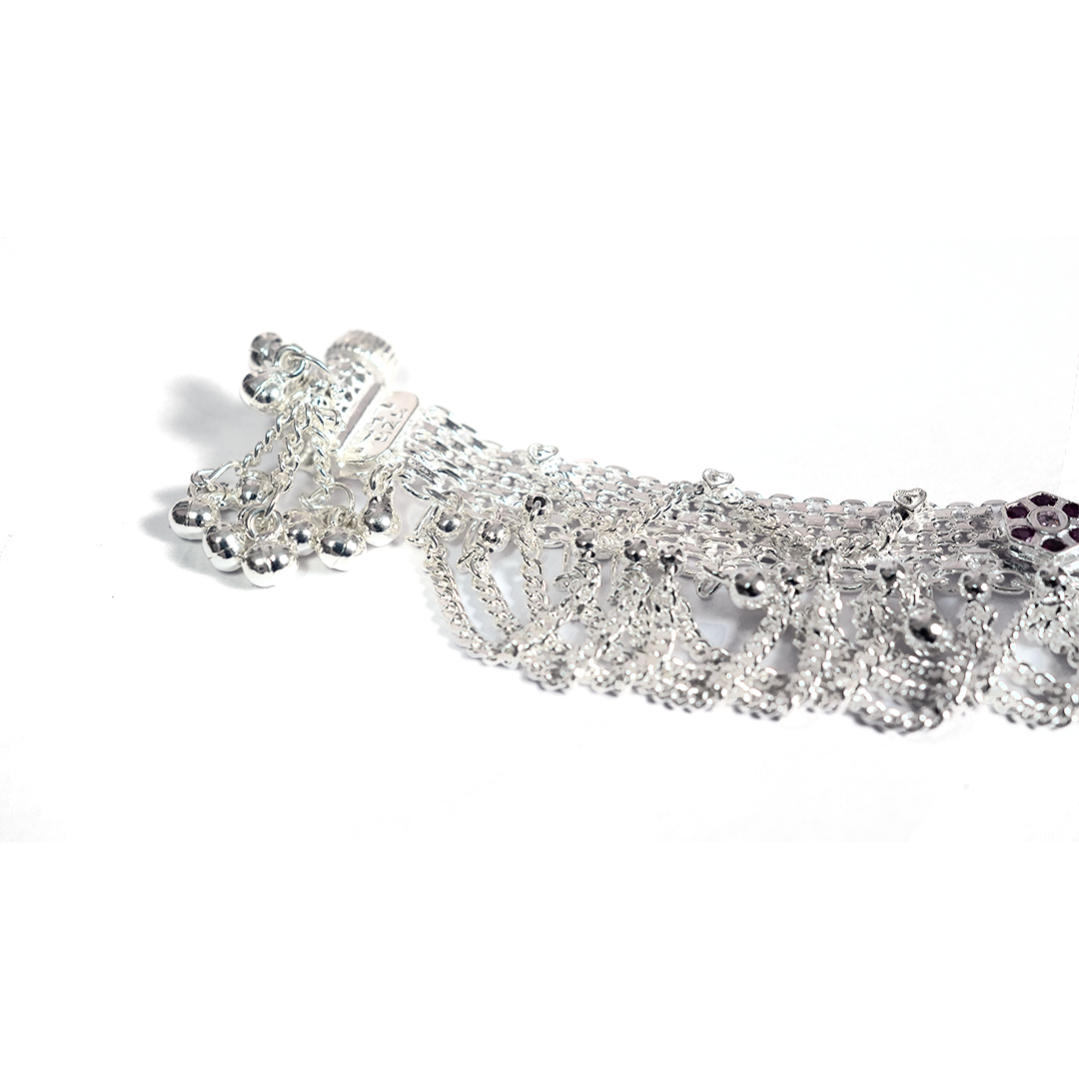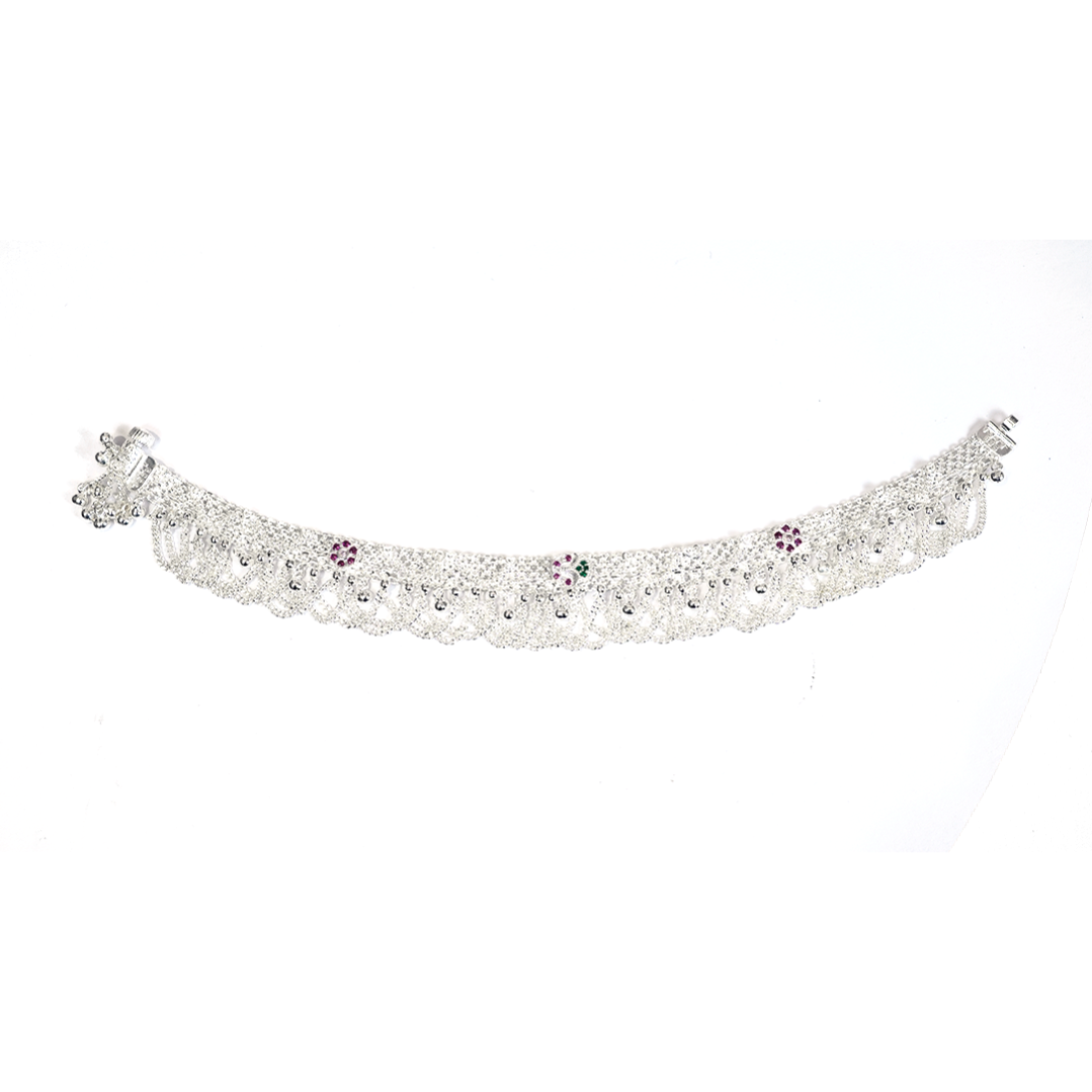 This beautifully crafted silver-plated payal combines intricate chain detailing with a graceful jhalar-style lower edge that moves delicately with every step. The addition of subtle multi-color stones enhances its traditional appeal while adding a refined touch of elegance.