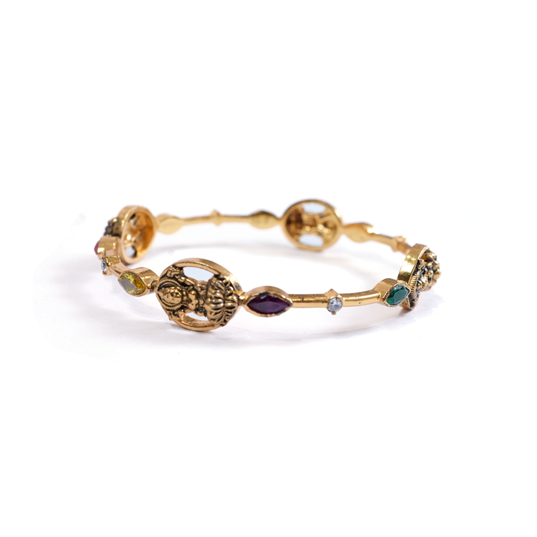 Beautiful antique-style gold-tone bangle featuring temple-inspired motifs and embellished with multicolored stones for an elegant traditional look.