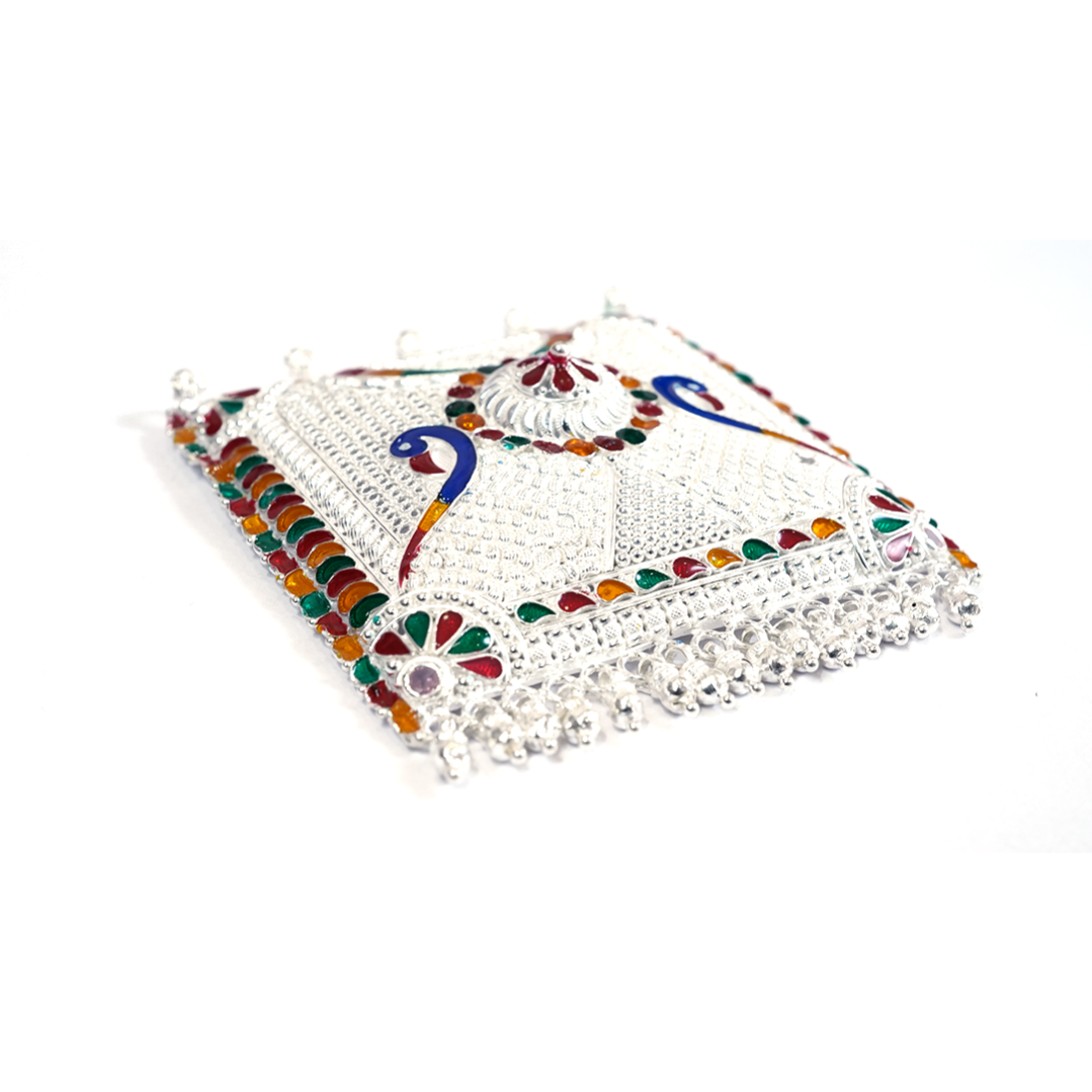 This beautifully crafted Silver Meenakari Double Peacock Wall Hanging showcases vibrant enamel detailing and intricate embossed patterns. Perfect for enhancing pooja rooms, doorways, and living spaces, it adds a touch of traditional elegance to your home décor.