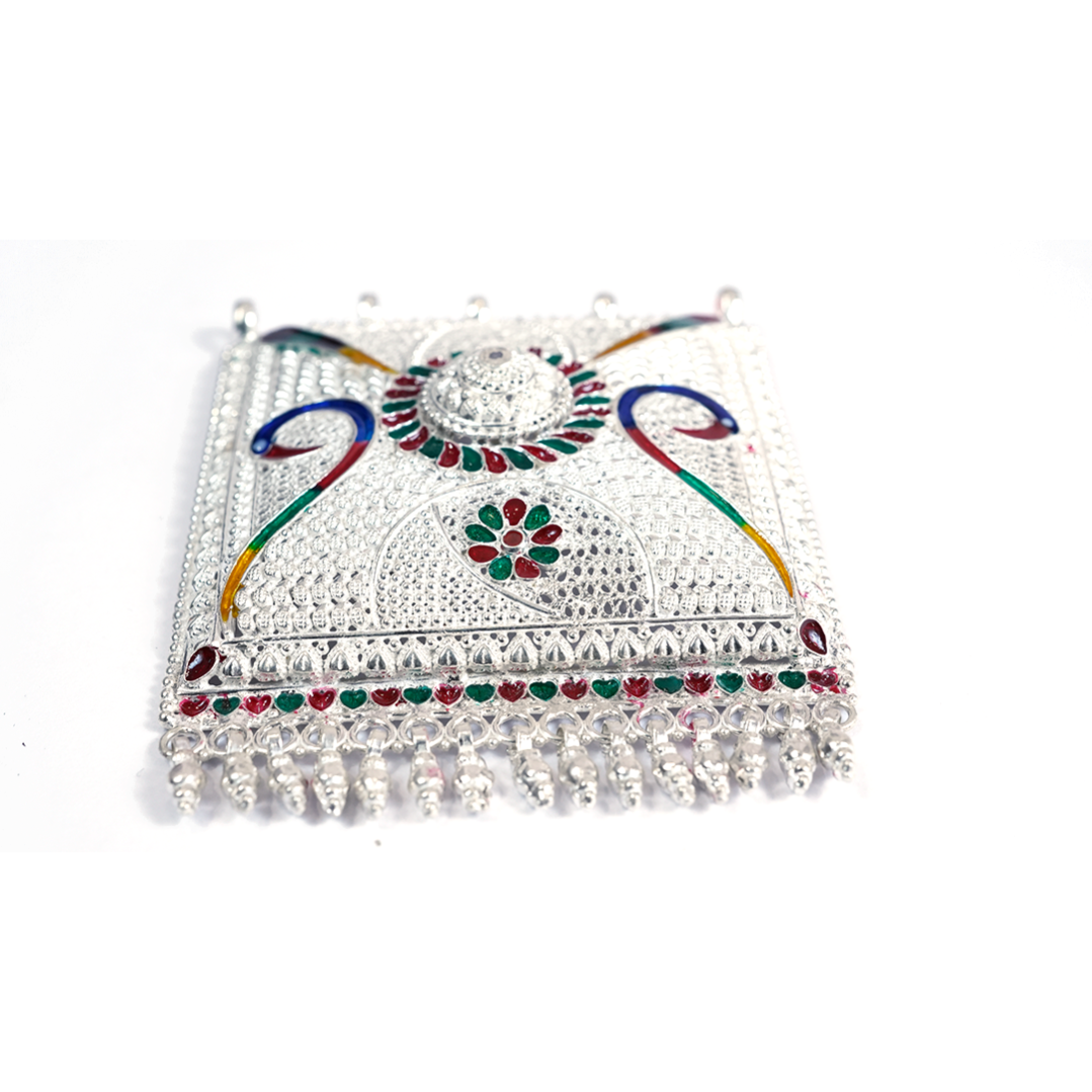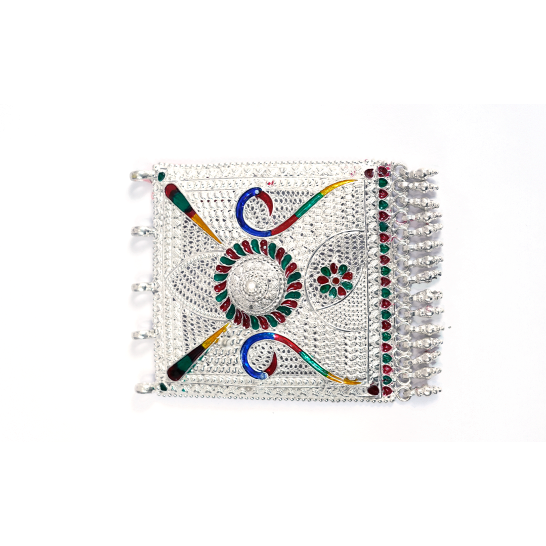 Striking Peacock Motif Choker. A dual-tone oxidized necklace featuring classic peacock designs, set with sparkling pink stones and finished with elegant pearl drops, secured by an adjustable black dori.