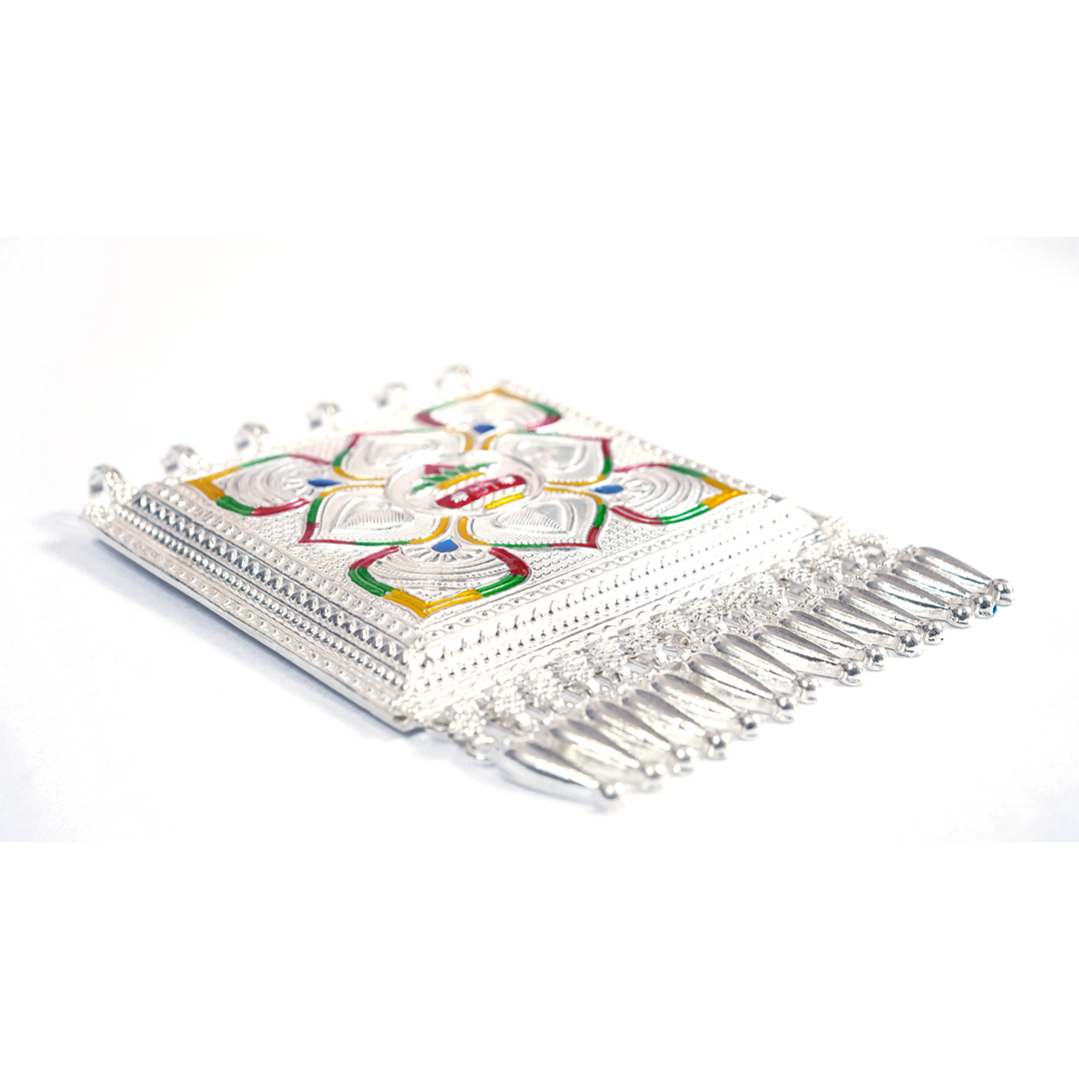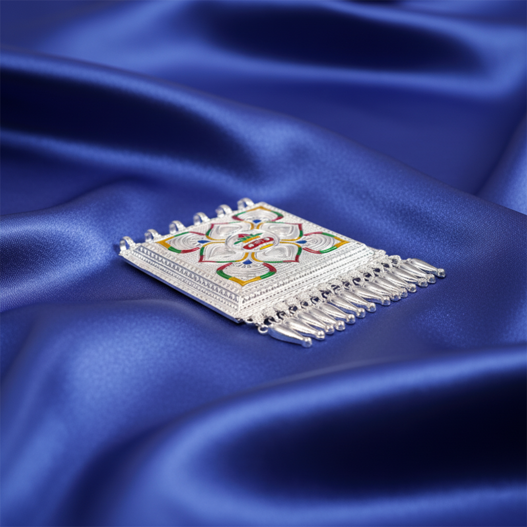 Description: Yeh ek bada, chaukor (rectangular) pendant hai, jismein Meenakari (enamel work) se bana hua ek bada Floral (Phool) design hai aur 'OM' ya 'Shree' ka chinha dikh raha hai.