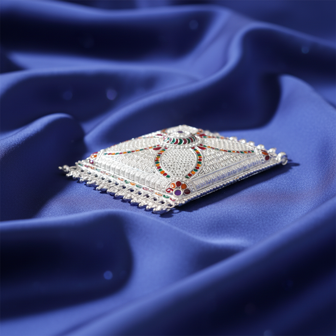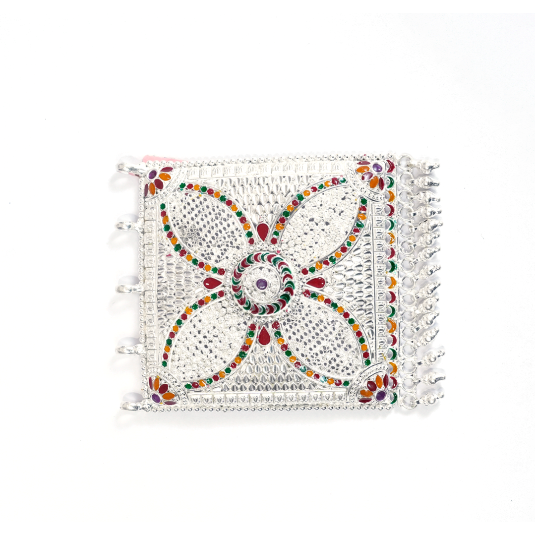 Grand Filigree Peacock Pendant. This large, oxidized rectangular piece showcases intricate Indian Jaali work with a vibrant multi-color Meenakari peacock design at the center, perfect for a heavy, authentic ethnic statement.