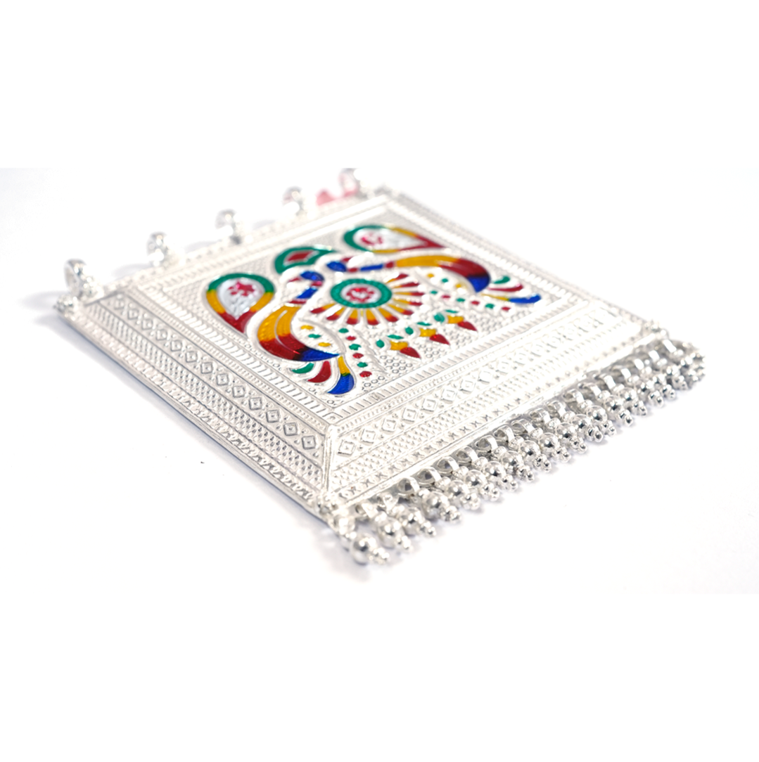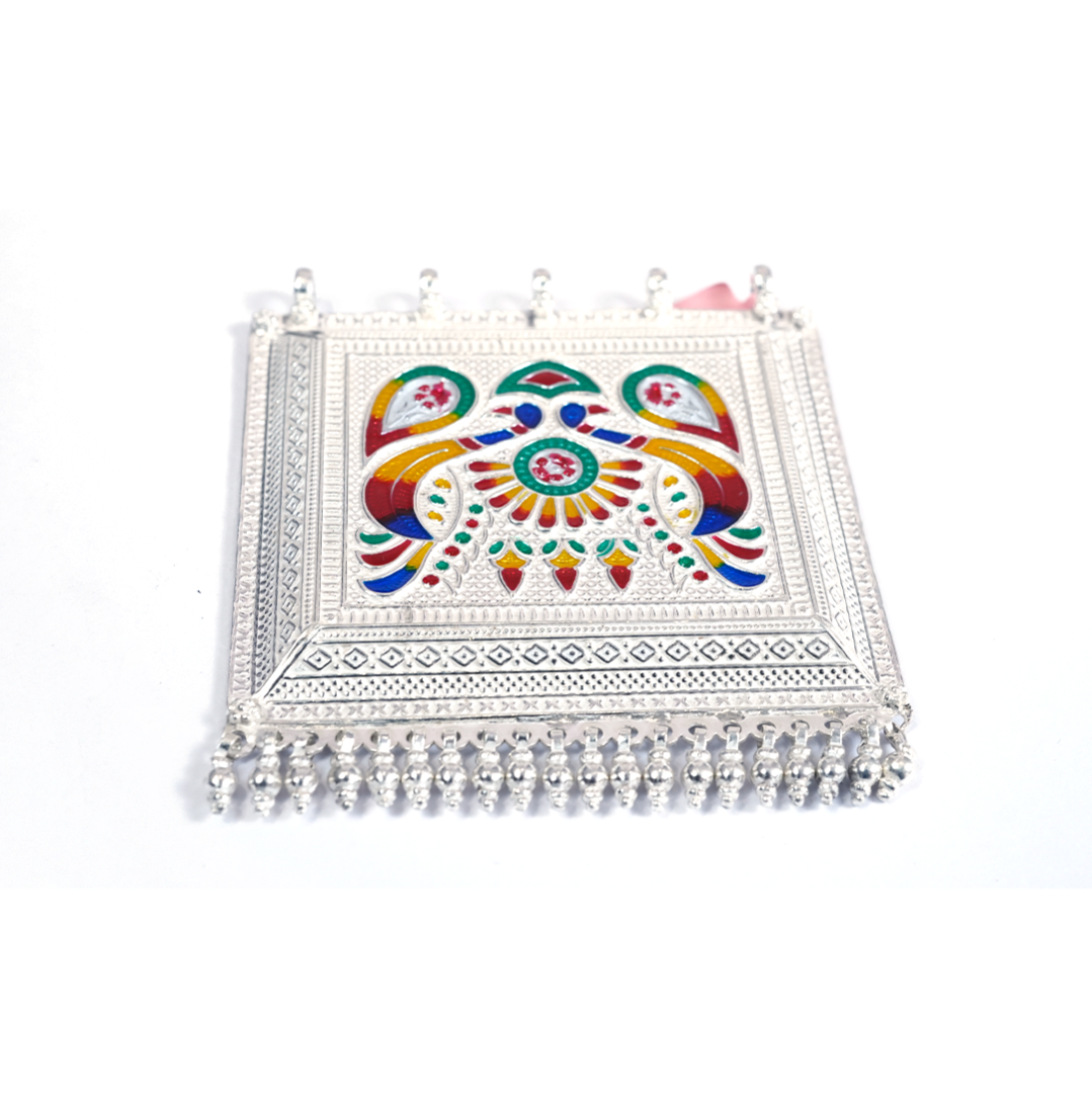 Striking Peacock Motif Choker. A traditional dual-tone oxidized necklace featuring classic peacock designs, set with sparkling pink stones and finished with elegant pearl drops, secured by an adjustable black dori.