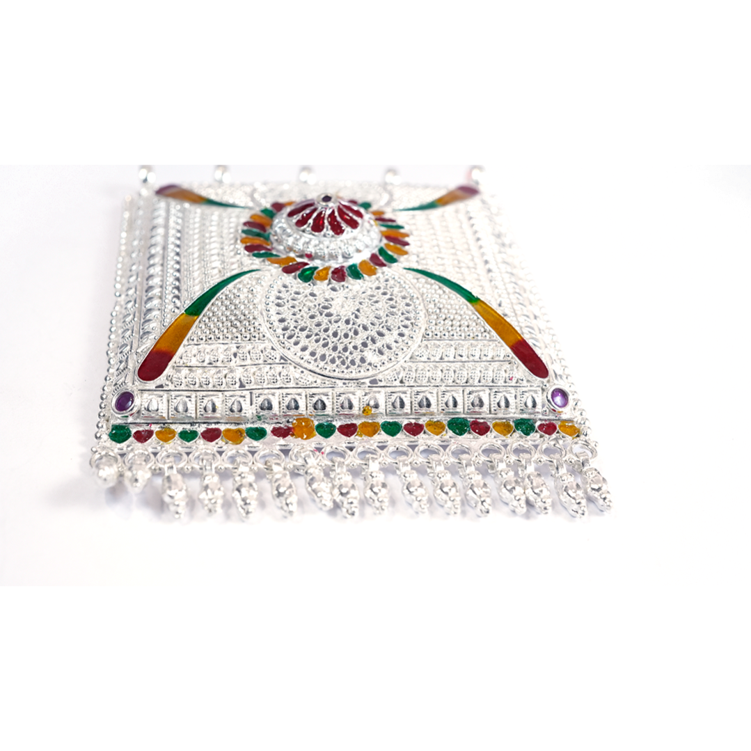 Striking Motif Choker. A dual-tone oxidized necklace featuring classic designs, set with sparkling pink stones and finished with elegant pearl drops, secured by an adjustable black dori.