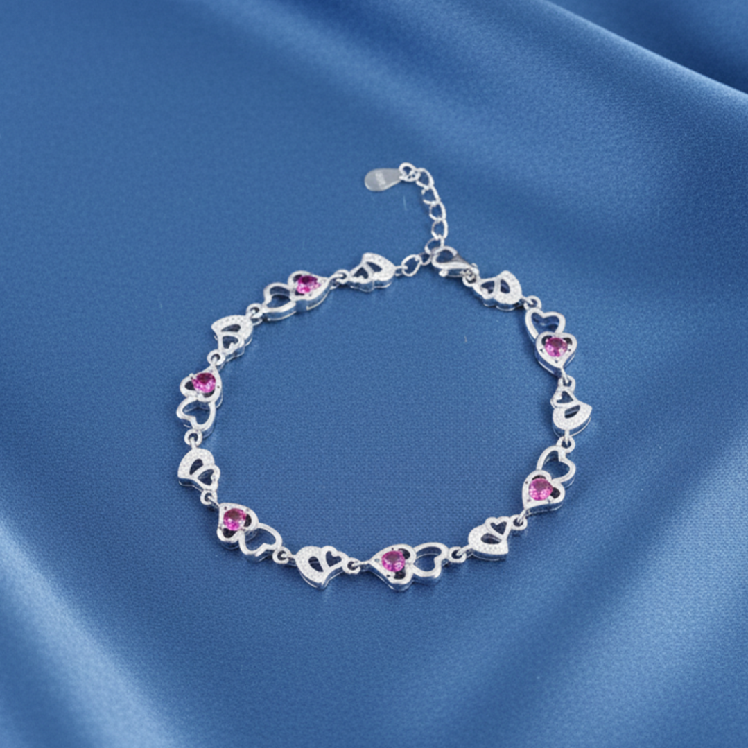 This is a delicate sterling silver-toned bracelet featuring interlocking open-heart links. Each link is accented with a sparkling, heart-cut pink or ruby stone, creating a romantic and elegant design. It includes an adjustable chain clasp for a perfect fit, making it ideal for everyday wear or as a thoughtful gift.