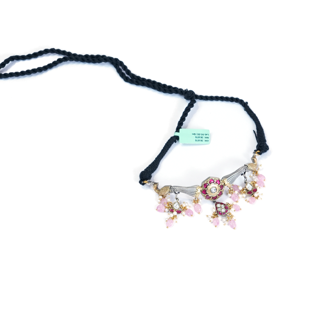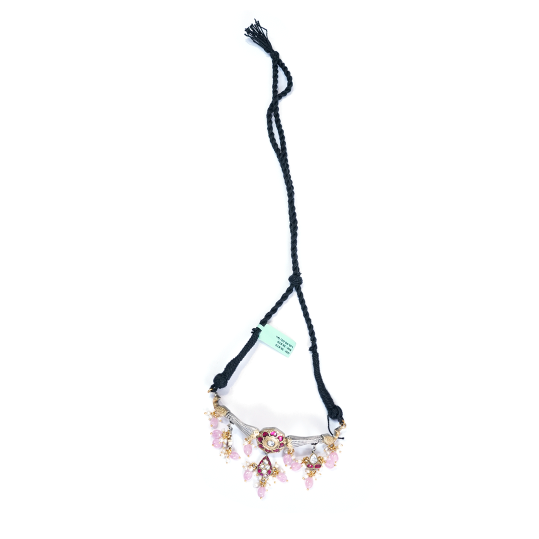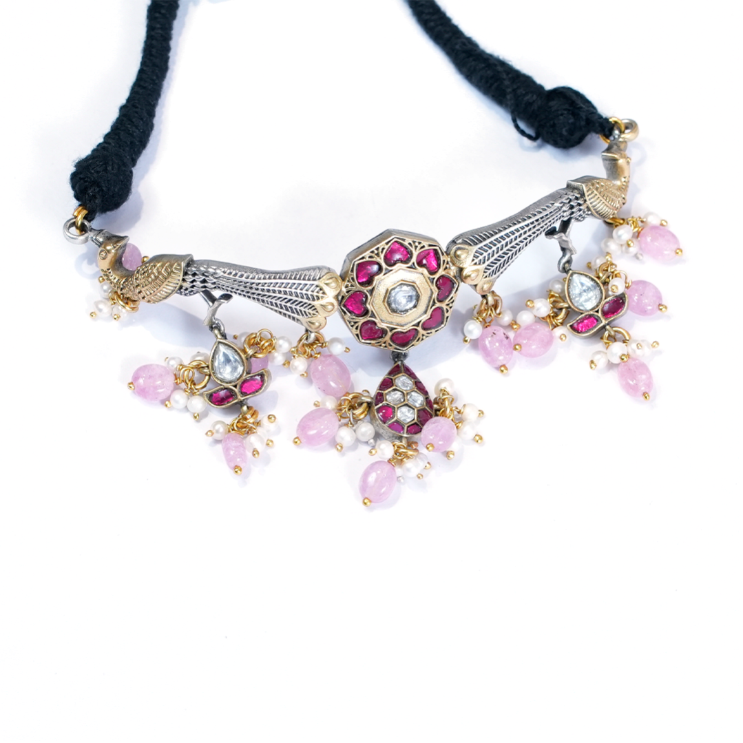 Oxidized Silver-Tone Traditional Indian Choker Necklace featuring Peacock and Floral Motifs, set with Pink and White Stones, and finished with Pearl Drops on a Black Dori.