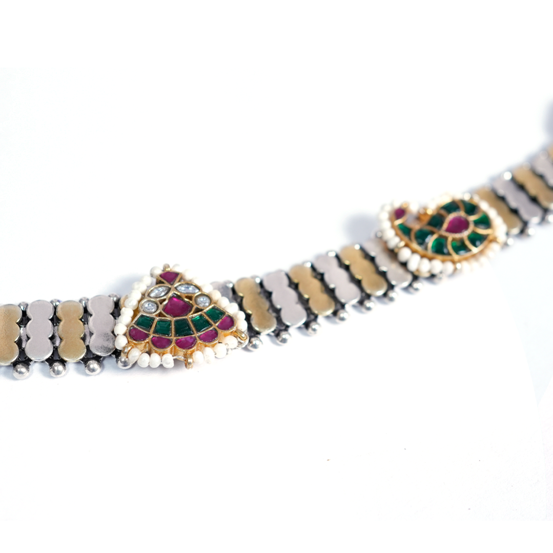 This traditional oxidised payal showcases a unique blend of heritage artistry and colorful elegance. Crafted with a sturdy oxidised silver finish, the design features multiple hand-crafted meenakari-style motifs adorned with vibrant red and green stones. The intricate detailing and antique look give it a royal and cultural charm.