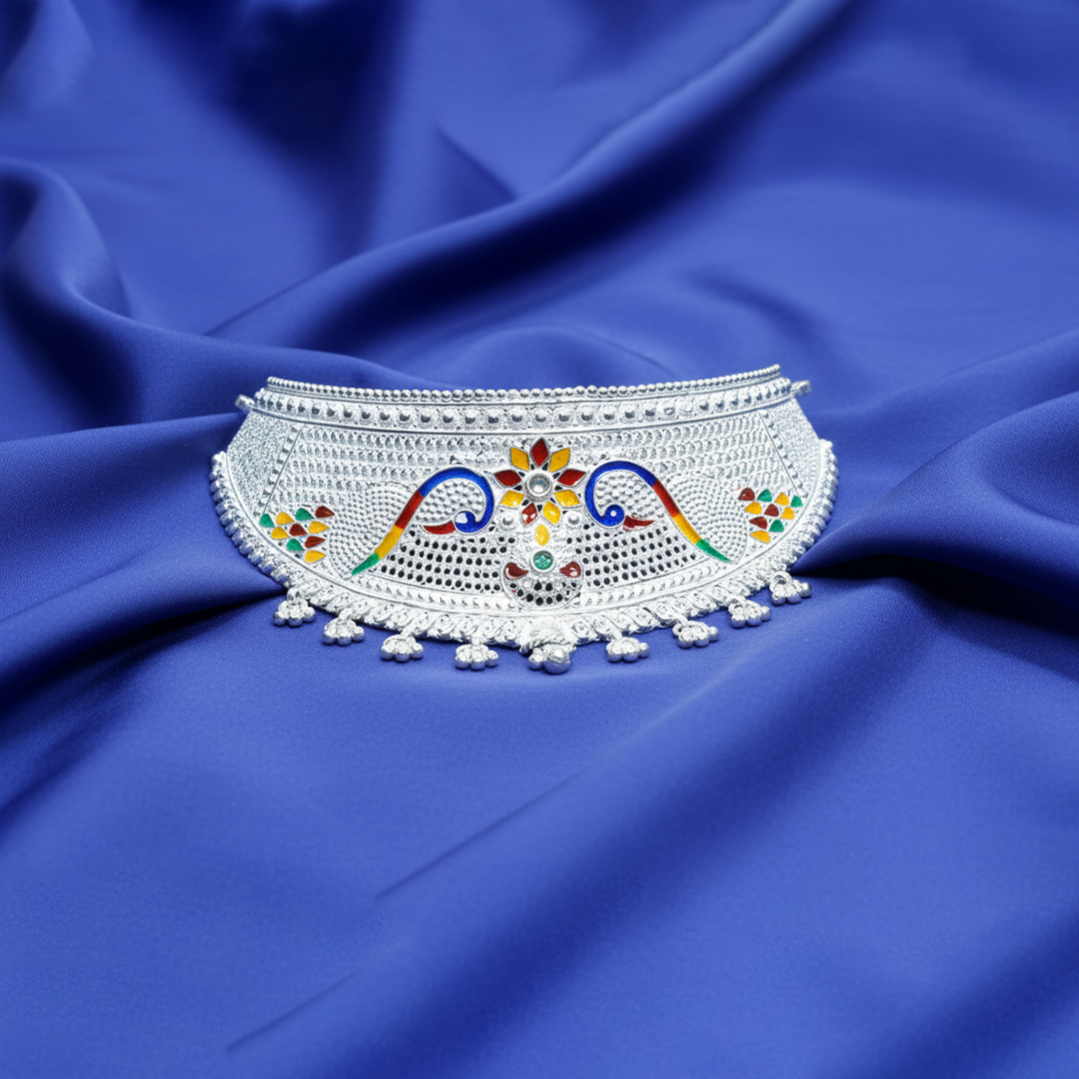 This elegant oxidised silver choker showcases detailed craftsmanship with colourful enamel work that adds a lively and artistic charm. Designed with a floral centrepiece and intricate hand-painted patterns, this necklace is perfect for enhancing traditional and festive looks.