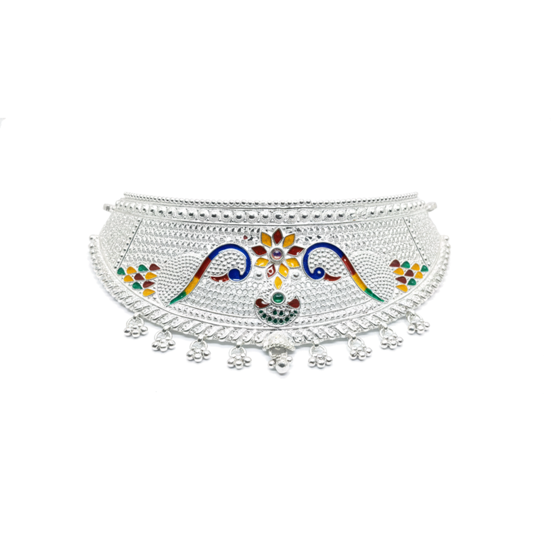A beautifully crafted oxidised silver choker featuring vibrant multicolour enamel artwork and delicate ghungroo hangings. Perfect for festive, cultural, and ethnic outfits.