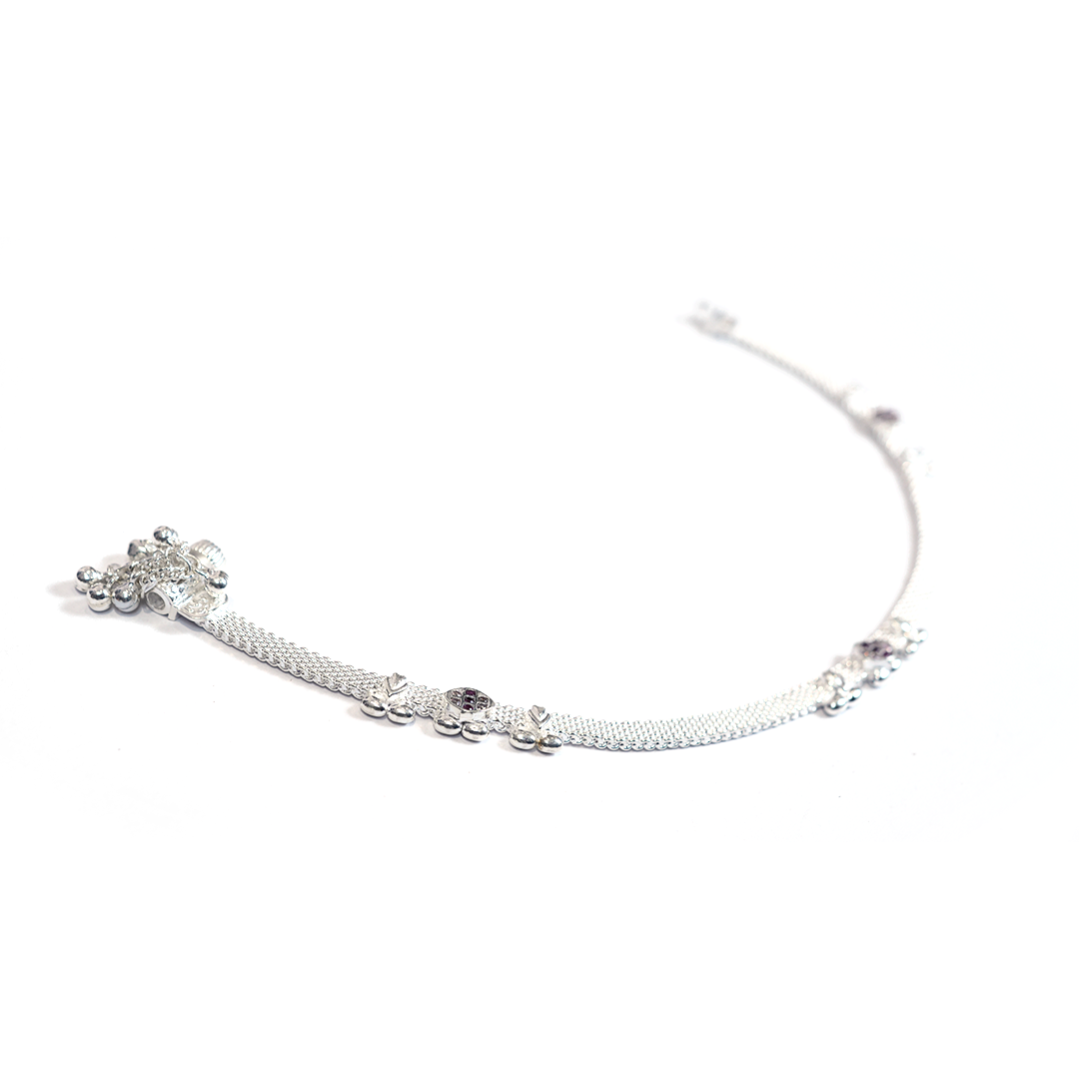 A beautifully handcrafted silver anklet featuring multi-layer chains, soft ghungroo accents, and coloured stone floral motifs. Perfect for weddings, festive wear, and traditional outfits.