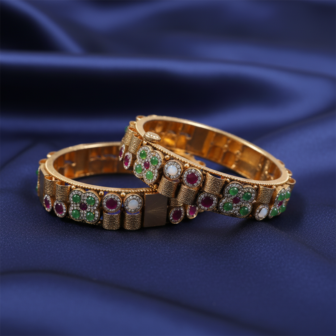 These Antique Gold Multi-Stone Floral Bangles bring together classic heritage styling and vibrant elegance. Designed in a beautifully textured matte gold finish, each bangle features a sequence of floral clusters adorned with green stones, ruby-toned stones, and pearl-like accents. The intricate arrangement is bordered with shimmering micro-stones, adding a graceful sparkle.