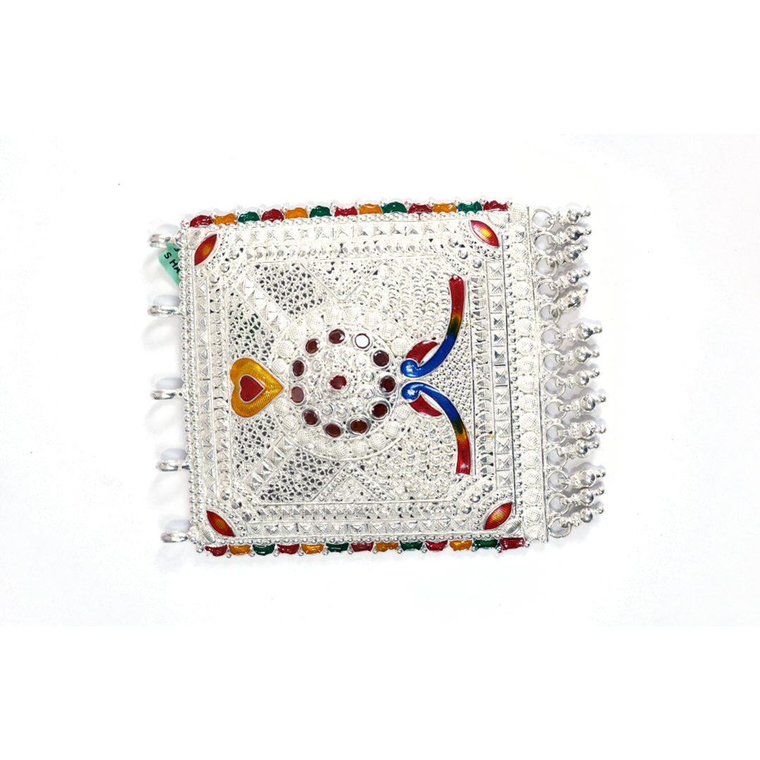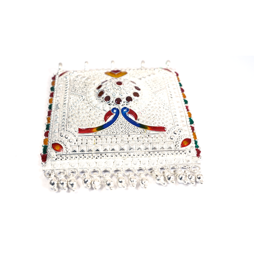 This beautifully handcrafted Silver Meenakari Decorative Wall Hanging features intricate embossed patterns and colorful enamel work. Its traditional design and detailed craftsmanship make it an elegant addition to pooja rooms, doorways, and home décor spaces.
