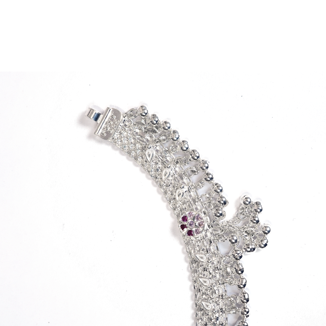 This premium silver-plated payal is a stunning blend of traditional artistry and elegant craftsmanship. Designed with intricate filigree lace patterns, it features beautifully detailed dangling charms that add a delicate musical touch with every step.