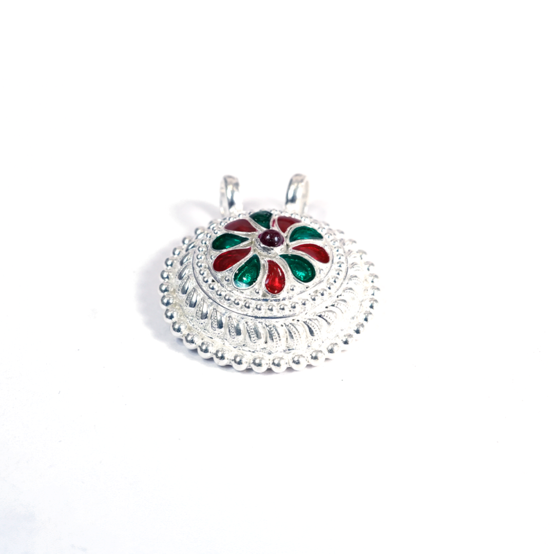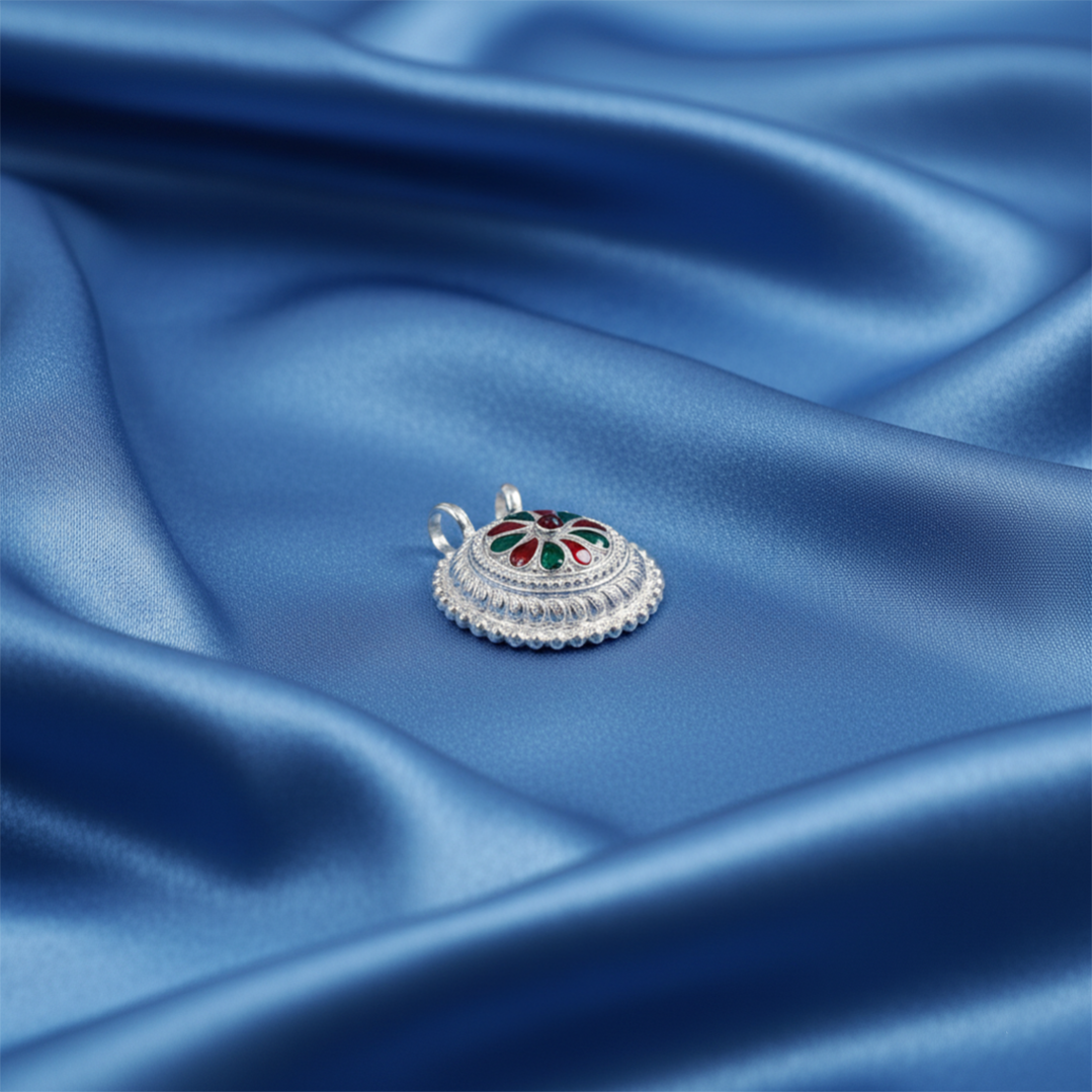 This handcrafted Silver Meenakari Pendant features a beautiful dome-shaped ethnic design with vibrant enamel detailing. Its elegant finish makes it perfect for pairing with traditional outfits, festivals, and daily ethnic wear.