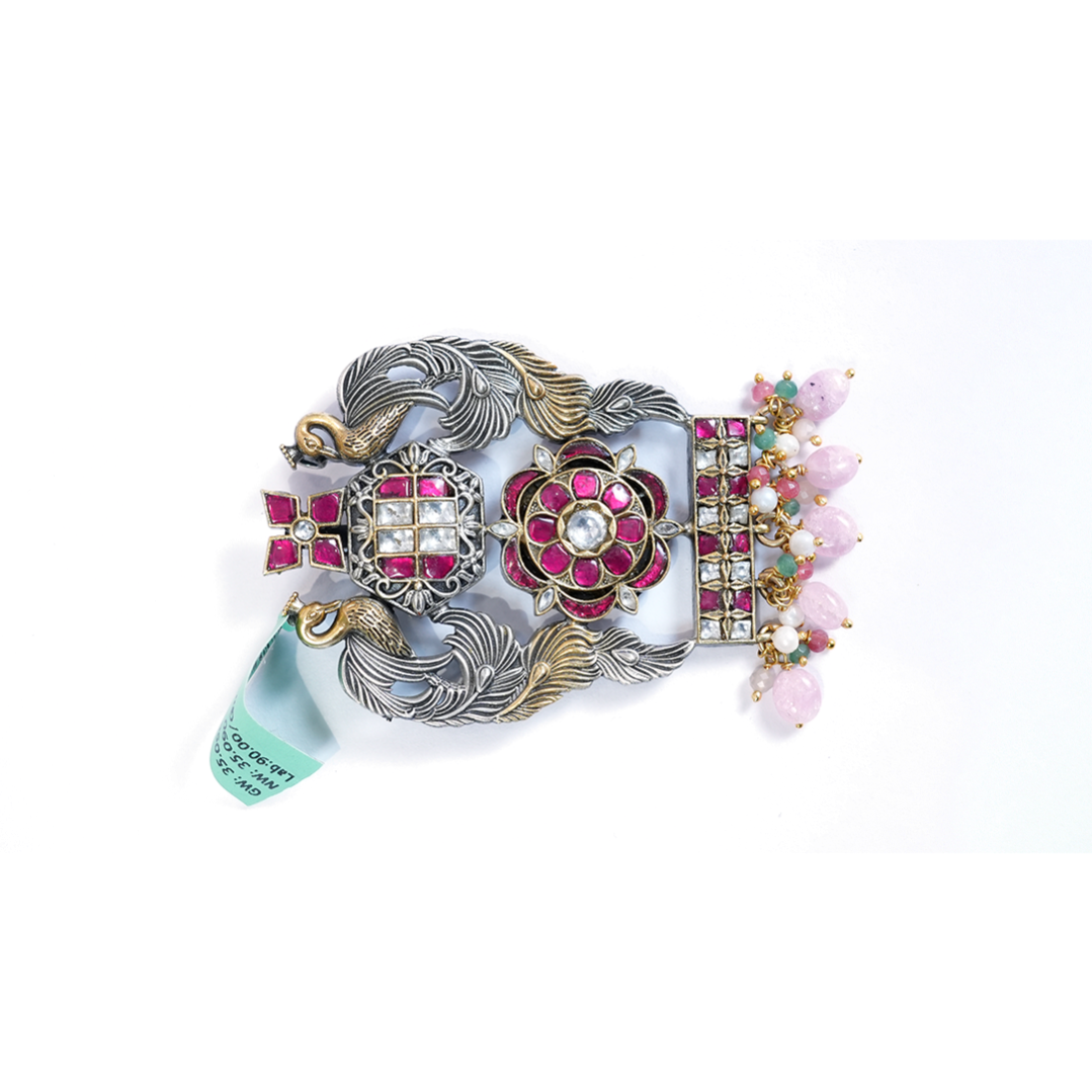 Striking Traditional Choker featuring an intricate oxidized silver-tone peacock and floral pendant, beautifully set with pink and clear stones and accented with vibrant multi-color drops.