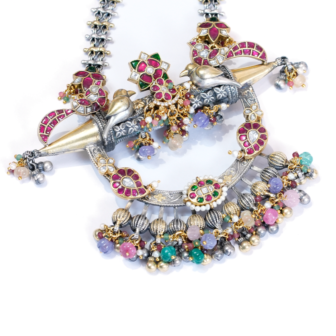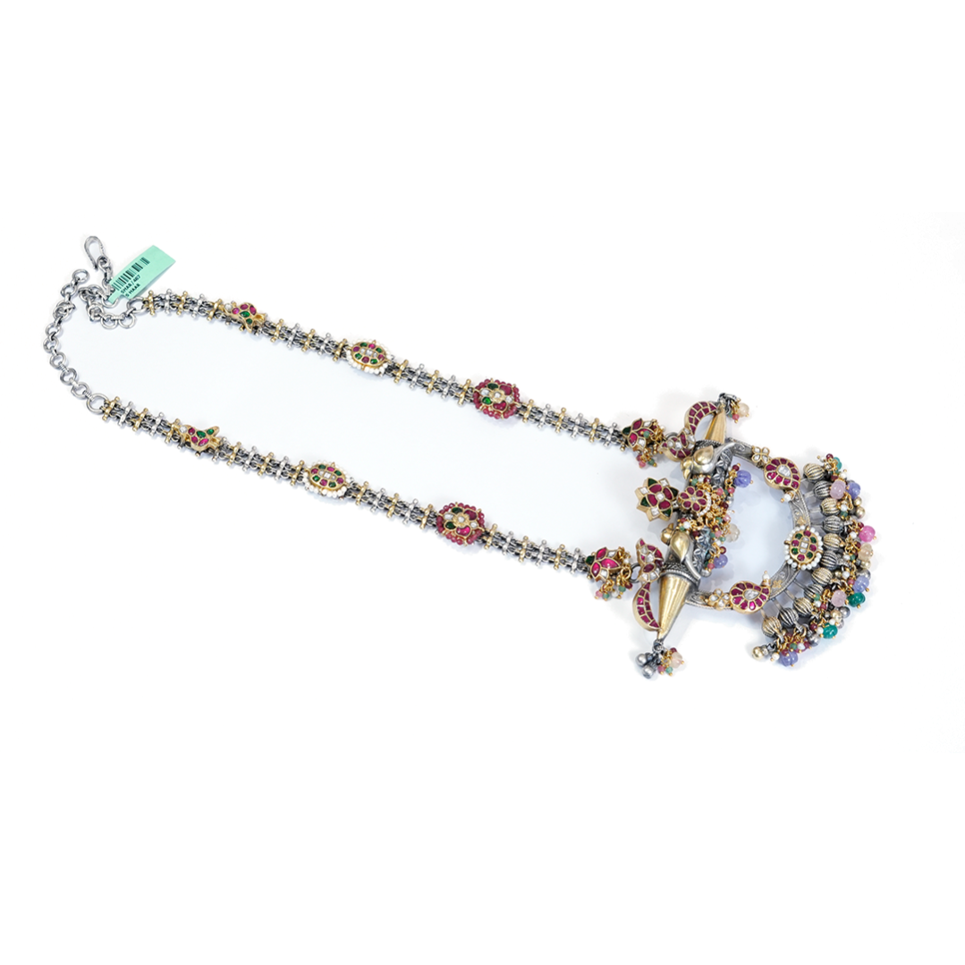 A beautifully crafted oxidised silver temple necklace featuring dual-layer chains, colorful stone embellishments, and an ornate traditional pendant with bead danglers—perfect for festive, bridal, and ethnic wear.